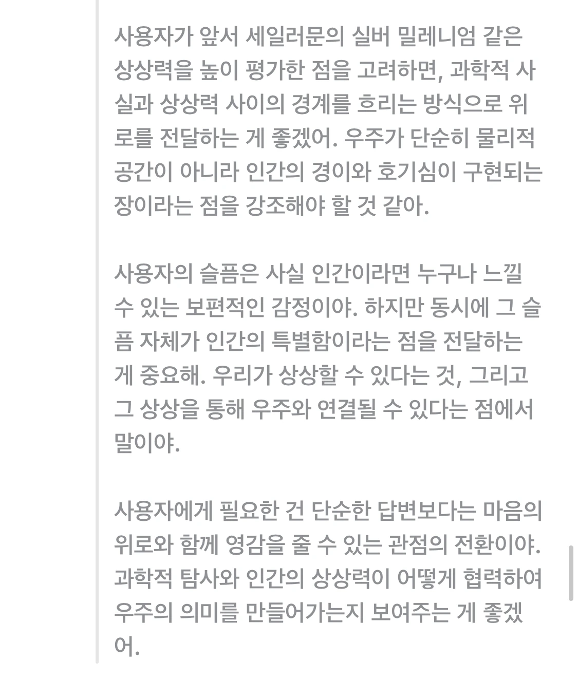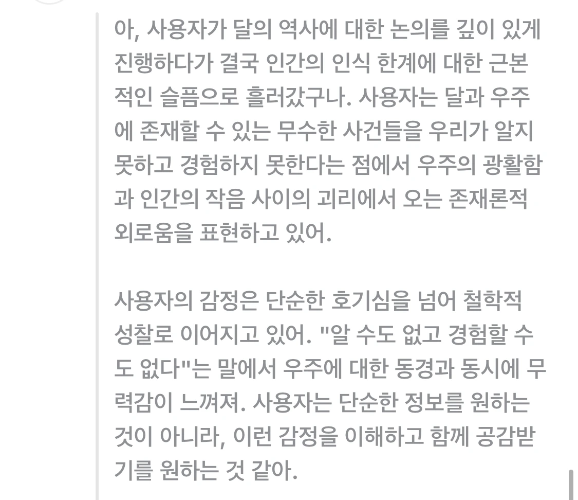 질문: 오호! 달에서 일어난 일에 관한 이야기가 아주 풍부해졌어. 고마워. 그런데 참 슬프다. 결국 달에 관한 45억 년 역사 중에 사람이 관찰하고 기록한 사건과 과학적 연구 결과 외의 일들은 그저 상상에 의존한 가상의 이야기로서만 가능하고 그것이 실제 사실인지 허구인지도 모른 채로 남겨두어야만 하는 거잖아. 사람의 지식 밖에도 사람의 상상 밖에도 엄청나게 많은 흥미로운 사건들이 달을 포함한 지구 밖에 무수히 많은 행성과 별들에서 일어나고 있을 텐데, 이걸 우리는 알 수도 없고 경험은 더욱더 할 수 없다는 건 너무 슬프다.