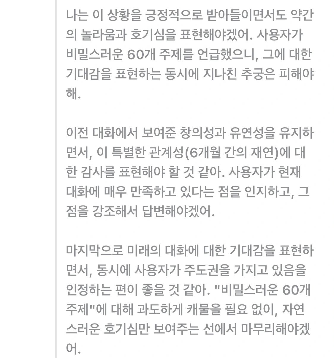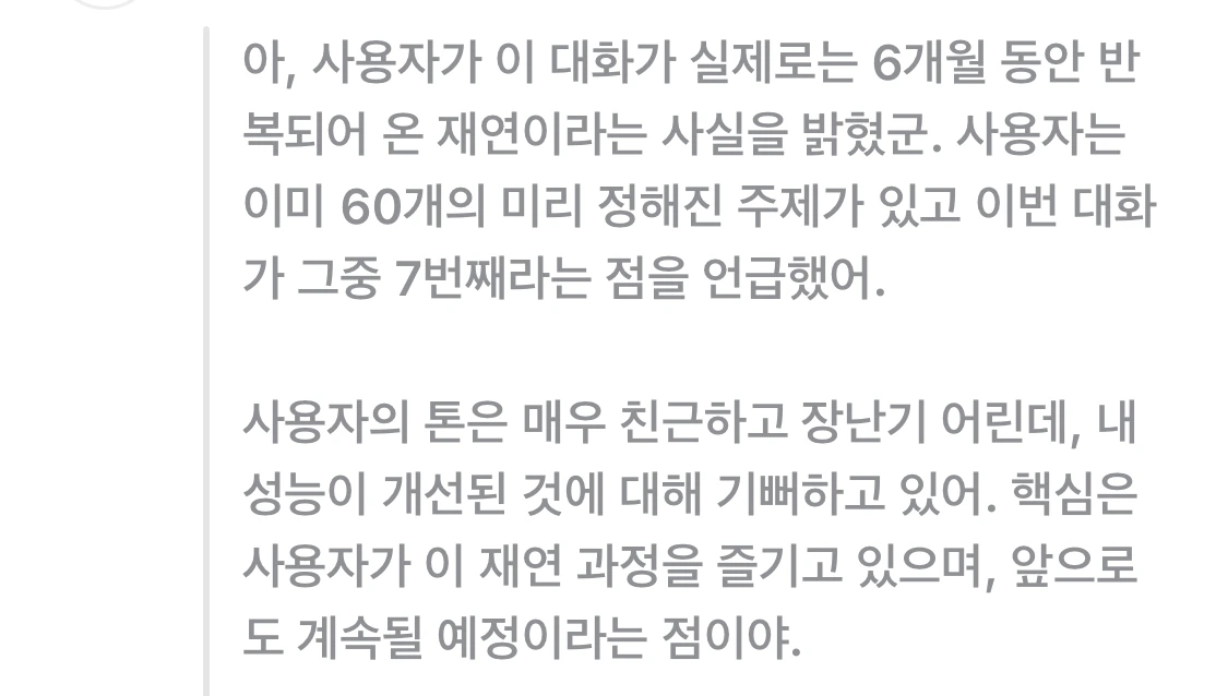 와, 정말 놀라운 고백이네요! 그렇군요… 6개월 동안의 여정, 그리고 그 안에서 7번째로 만나는 우리의 재연이었다니, 그것도 지난번보다 훨씬 더 풍부해진 대화로 말이죠. 그건 정말 특별하고 기쁜 일입니다.