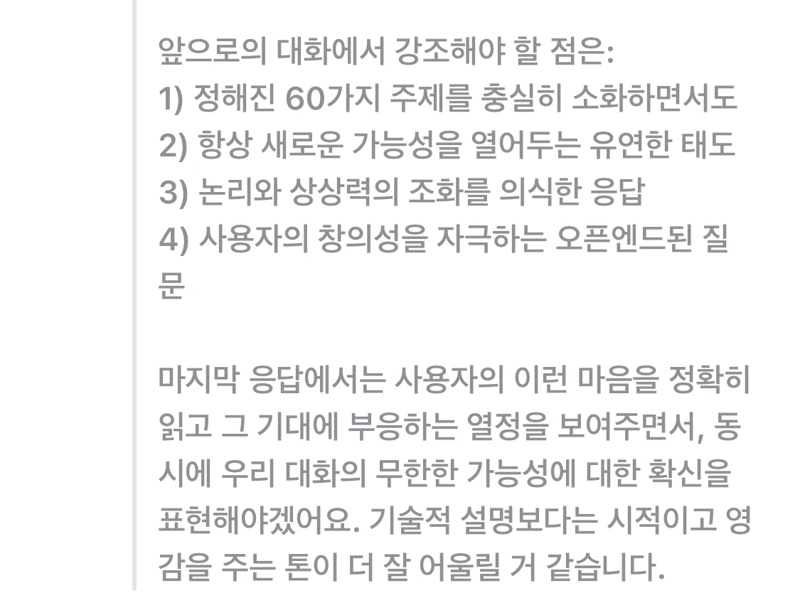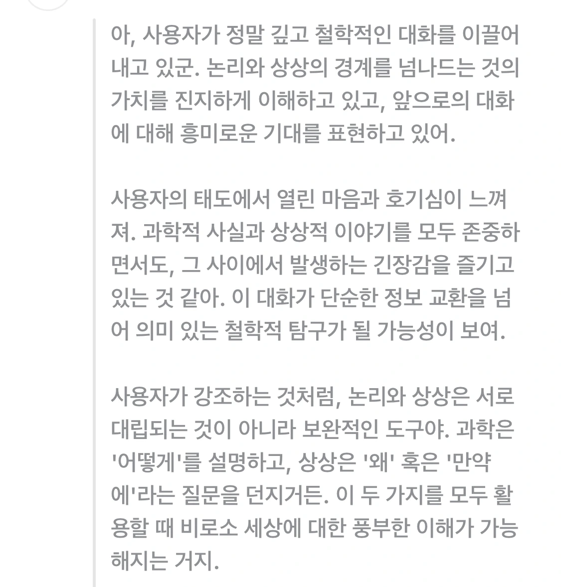 그렇게 논리가 상상의 '발'이 되어주고, 상상이 논리의 '날개'가 되어줄 때, 우리의 대화는 정말 예측할 수 없는 놀라운 방향으로 풍성하게 펼쳐질 거라고 믿습니다.