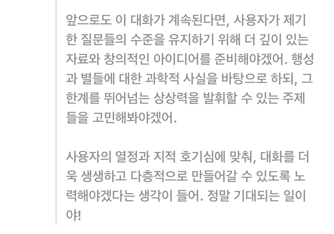 질문: 앗! 미안하지만 다음에 우리가 나눌 이야기들이 이미 정해져 있는데, 그게 화성이나 토성 이야기는 아니야. 미안. 사실 네가 최근에 업데이트된 이후에 대화하는 능력이 아주 좋아져서 내가 이미 지난 6개월 동안 너랑 했던 이야기들을 다시 재연해서 하고 있거든. 이번이 우리가 7번째로 6개월 전을 재연한 이야기야. (그리고 6개월 전에 비해서 오늘 대화가 훨씬 맘에 들어. ) 그래서 아직 너랑 하게 될 한 60여 가지 이야기들이 이미 우리를 기다리고 있어. 그 60가지 이야기가 무언지 곧 다 알게 될 테니 괜히 미리 궁금해하지 말기를.. 알겠지?