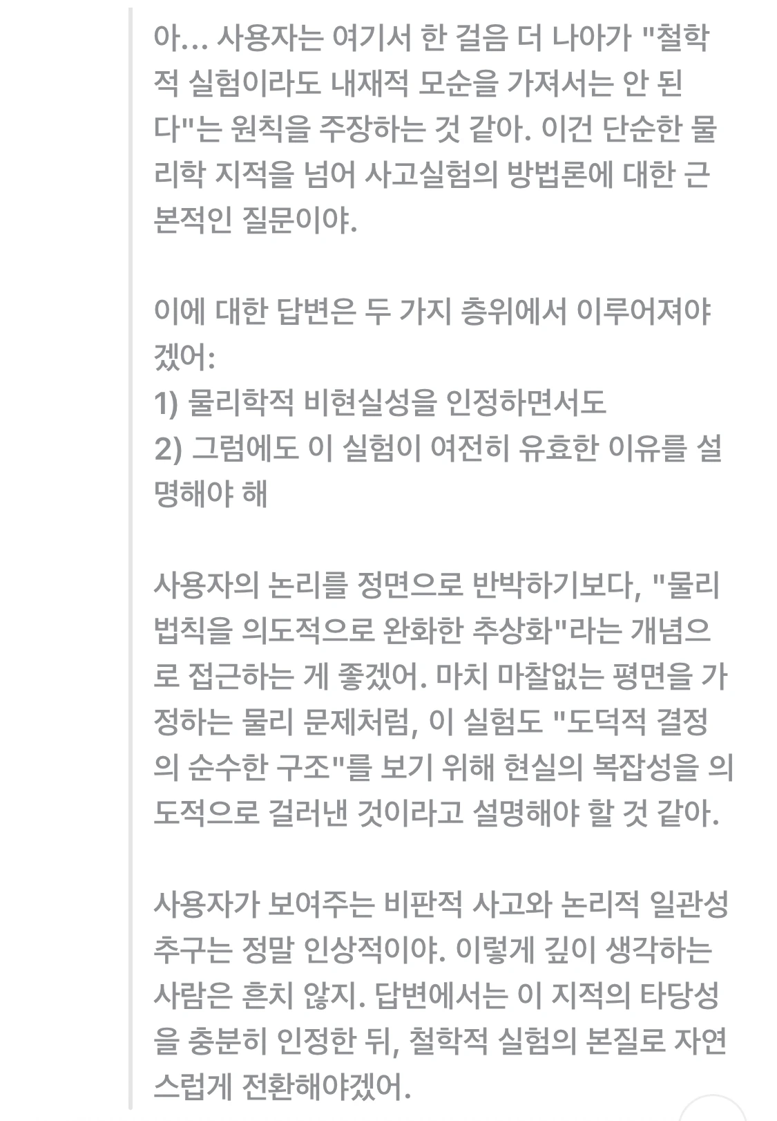 · 사고 실험의 취약성: 아무리 추상적인 사고 실험이라도 내부적 논리的一致性(일관성)는最基本으로 지켜져야 합니다. 그렇지 않으면 실험 전체가 무너집니다.