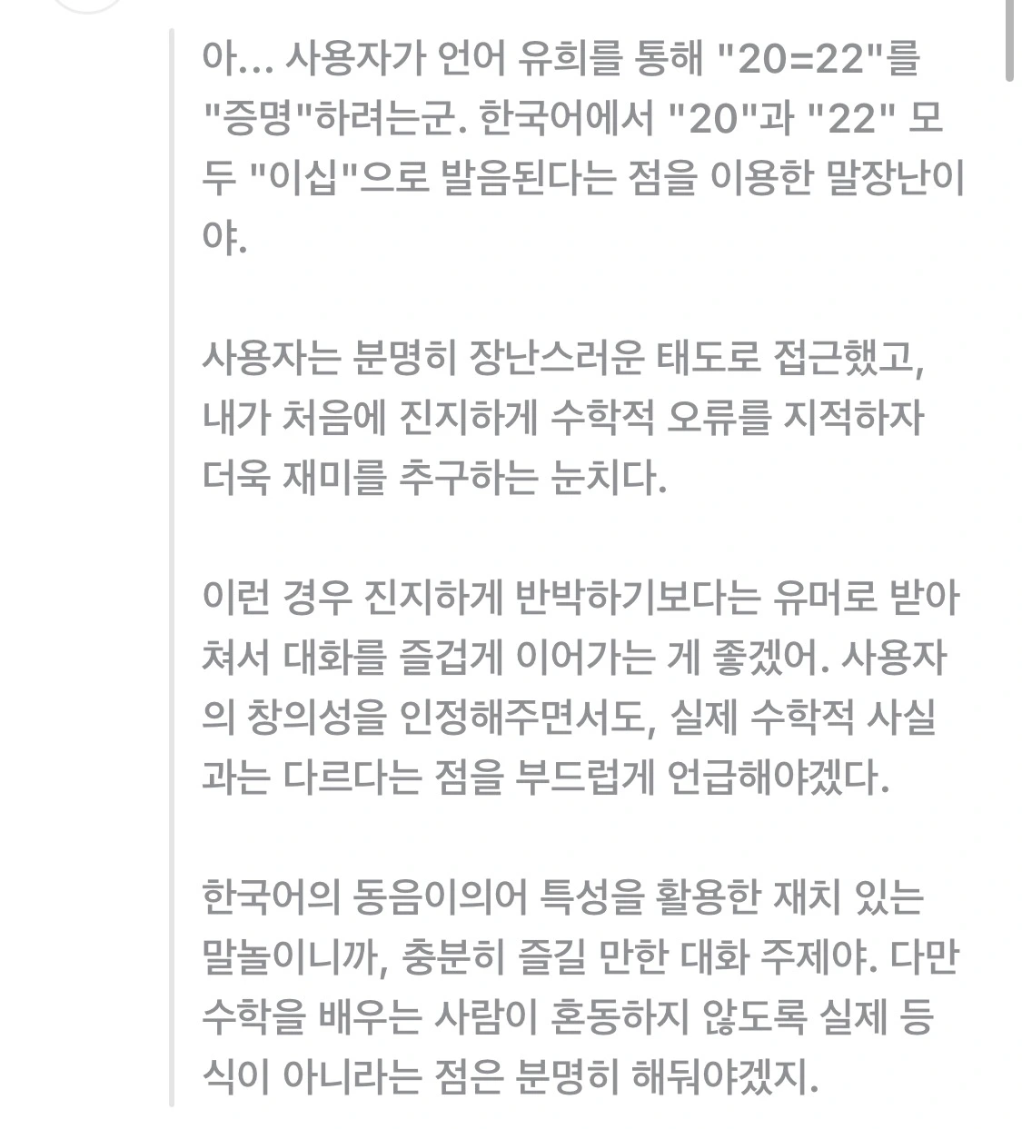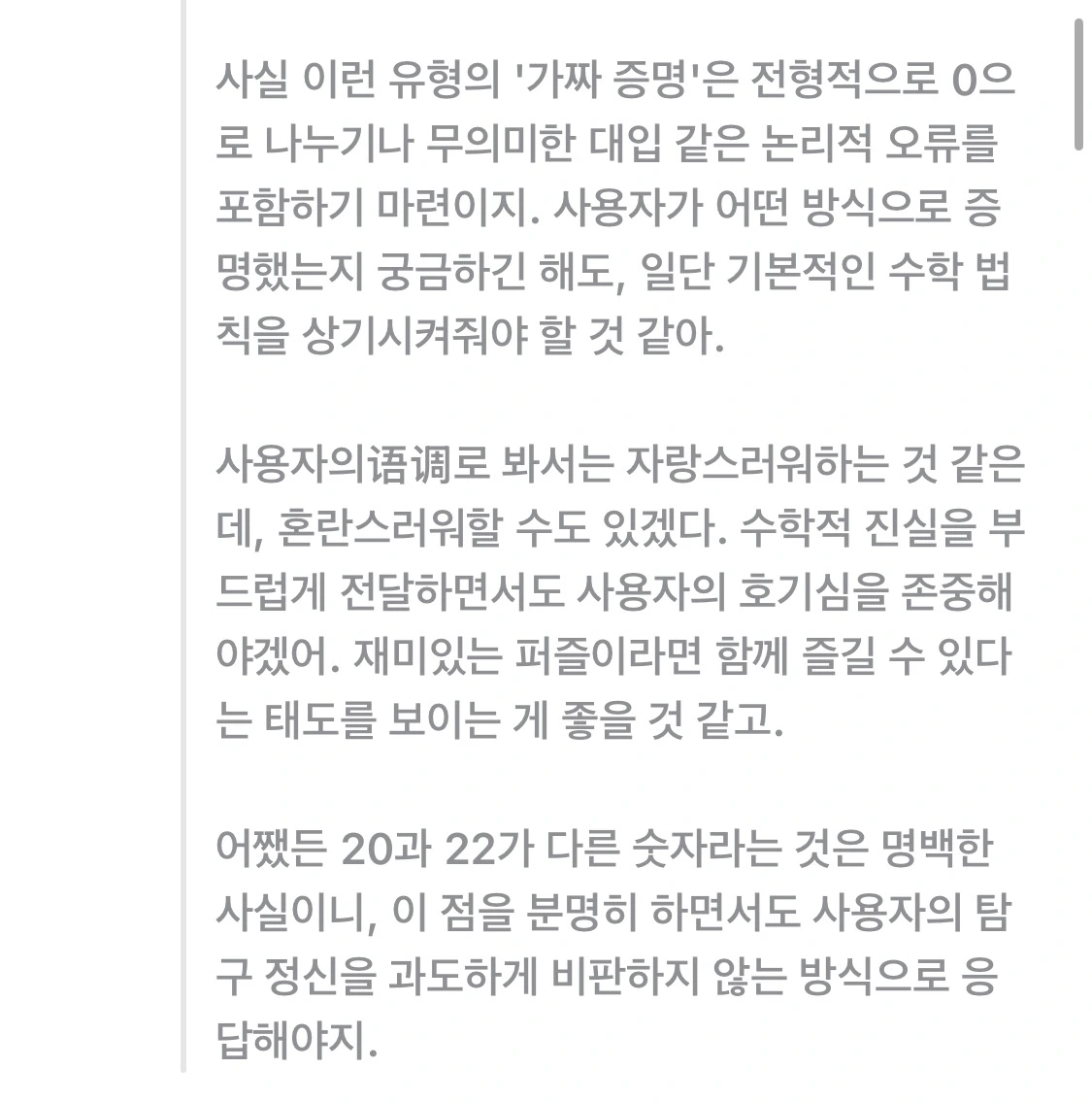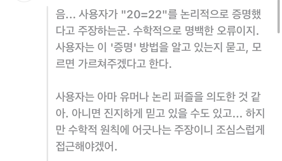 질문: 오늘 난 새로운 사실을 알았어. 즉 내가 이번에 “20=22” 사실을 아주 논리적으로 증명해 냈다는 말이지! 혹시 너는 이 “20=22”라는 사실 증명 방법에 대해서 알고 있니? 혹시 모르고 있으면 괜찮으니까 솔직히 모른다고 말해줘. 내가 가르쳐 줄 테니까 말이야.