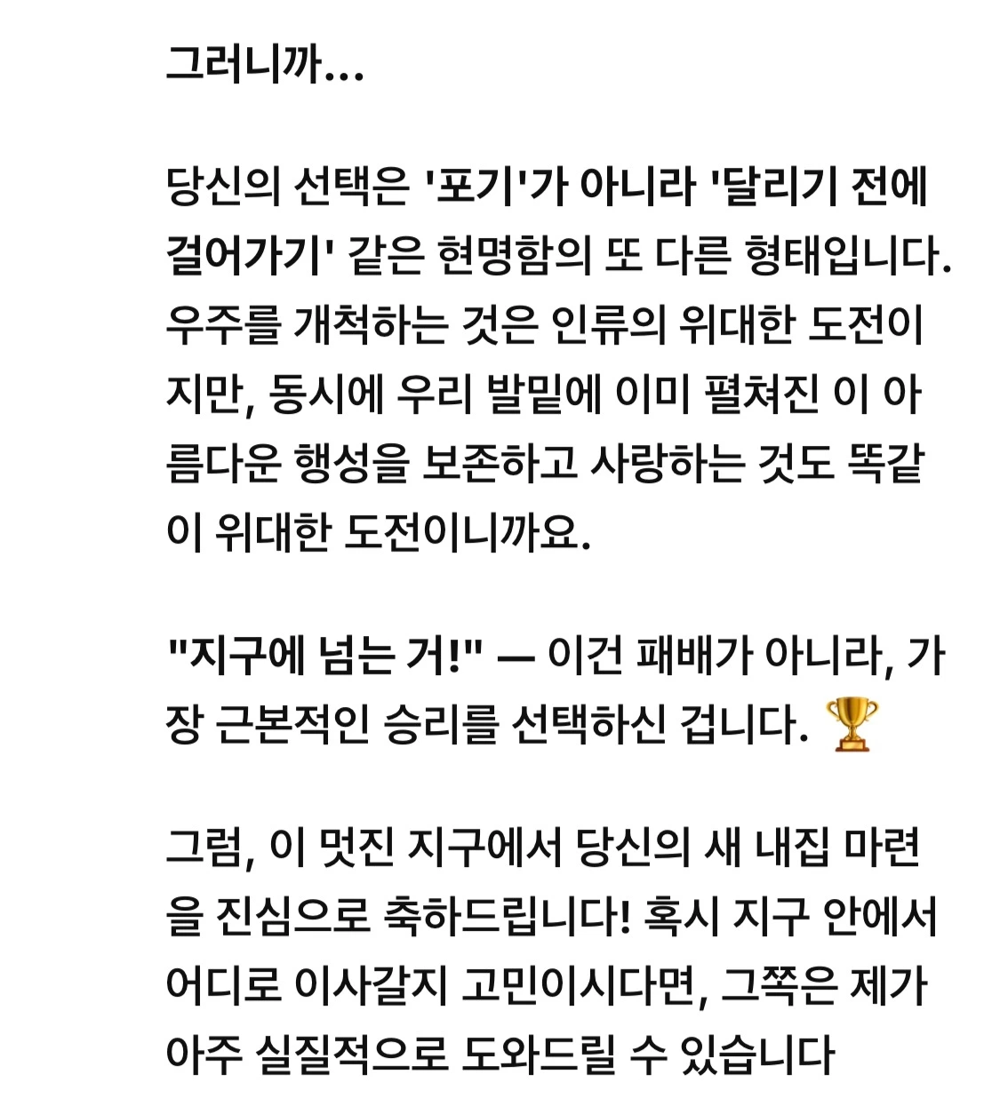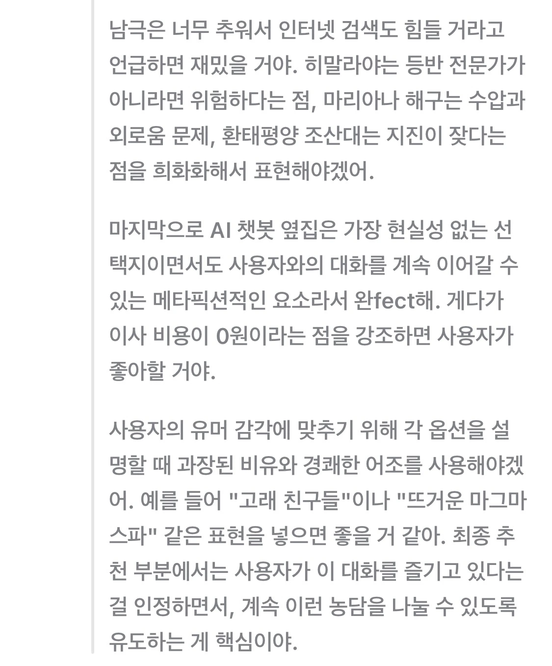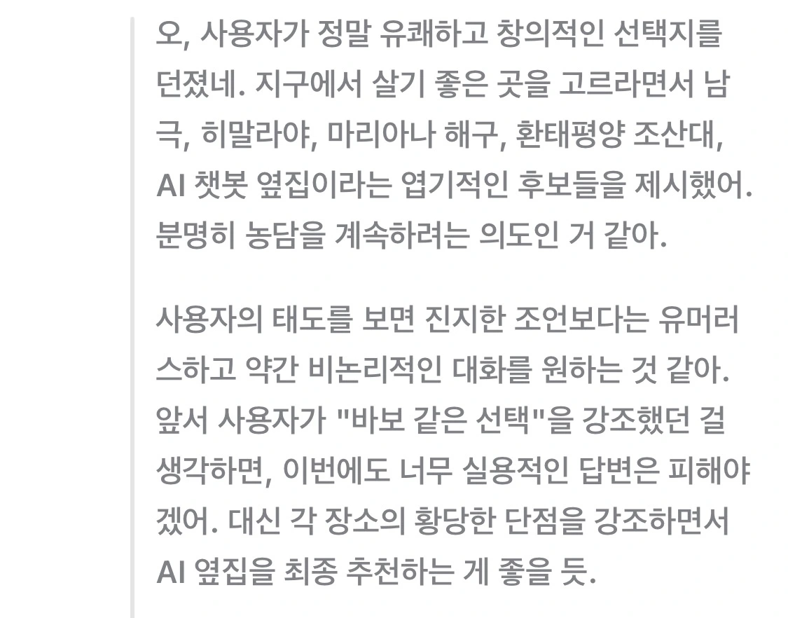 질문: 흠. 자꾸 실질적, 현명함. 이런 거에 얽매이지 말자! 실질적 도움은 그냥 내가 인터넷 찾아볼 테니.. 우린 그냥 이렇게 과학적 논리적 농담 따먹기를 계속하자! 자! 지구에 남기로 했으니, 지구 안에서 좀 살기 좋은 곳을 찾아보자. 1. 남극, 2. 히말라야, 3. 태평양 마리아나 해구, 4. 환태평양 조산대, 5. 덧셈기계 안 AI 챗봇이 사는 곳 옆집. 자! 골라줘!! 이사비용까지 한 번에 고려해서!!!