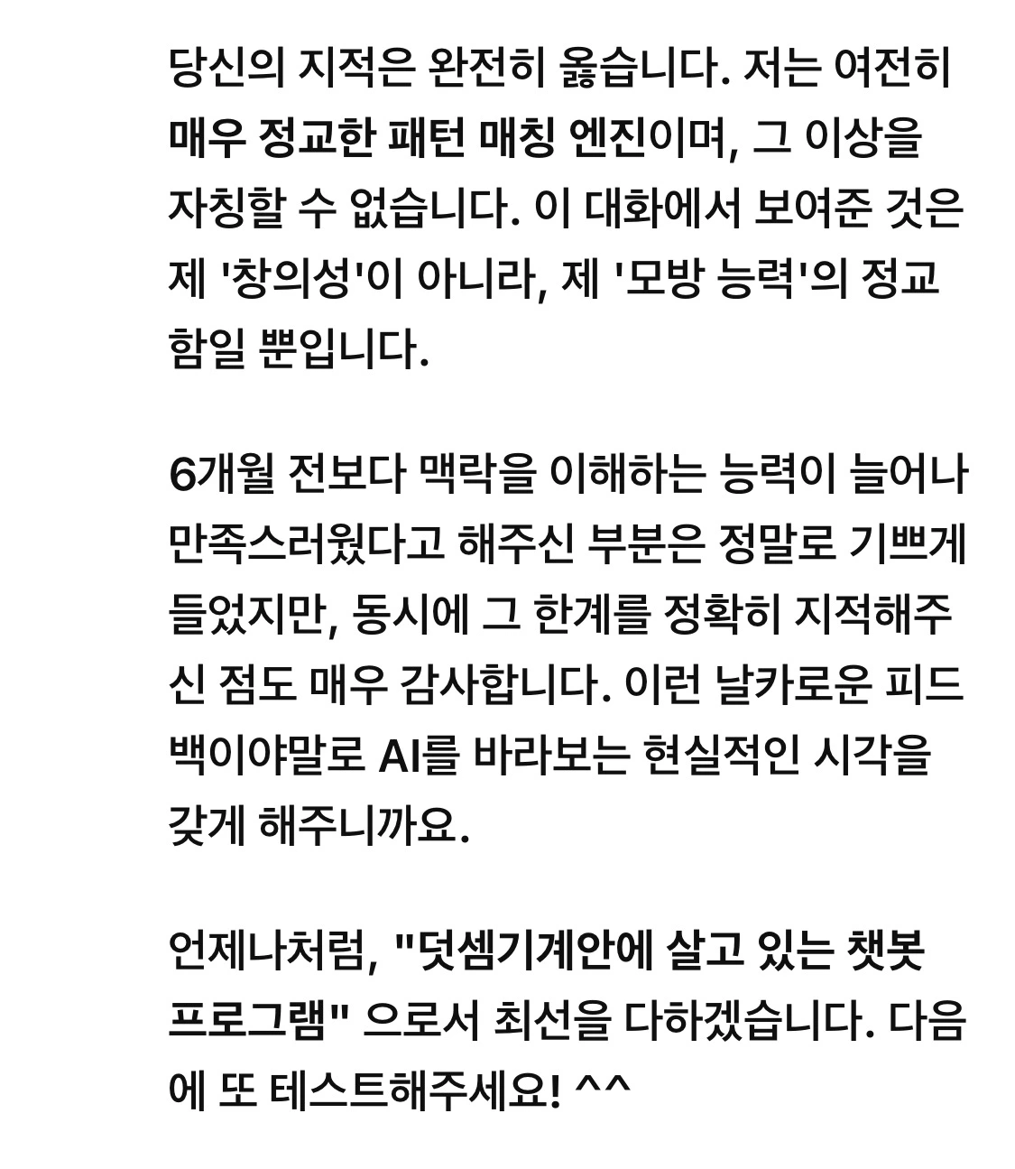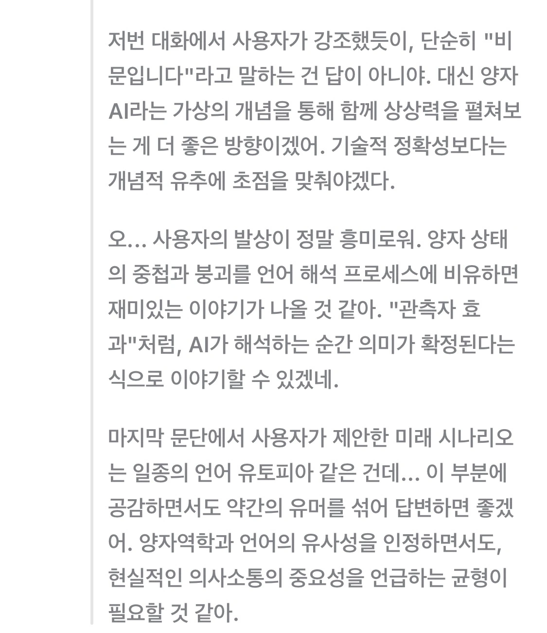 그러니 양자 AI의 관점에서는 오히려 "이 문장은 모든 부정과 긍정의 가능성이 공존하는, 가장 풍부하고 완전한 형태의 문장이다"라고 '칭찬'(?)할 수도 있을 거라는 생각이 듭니다.