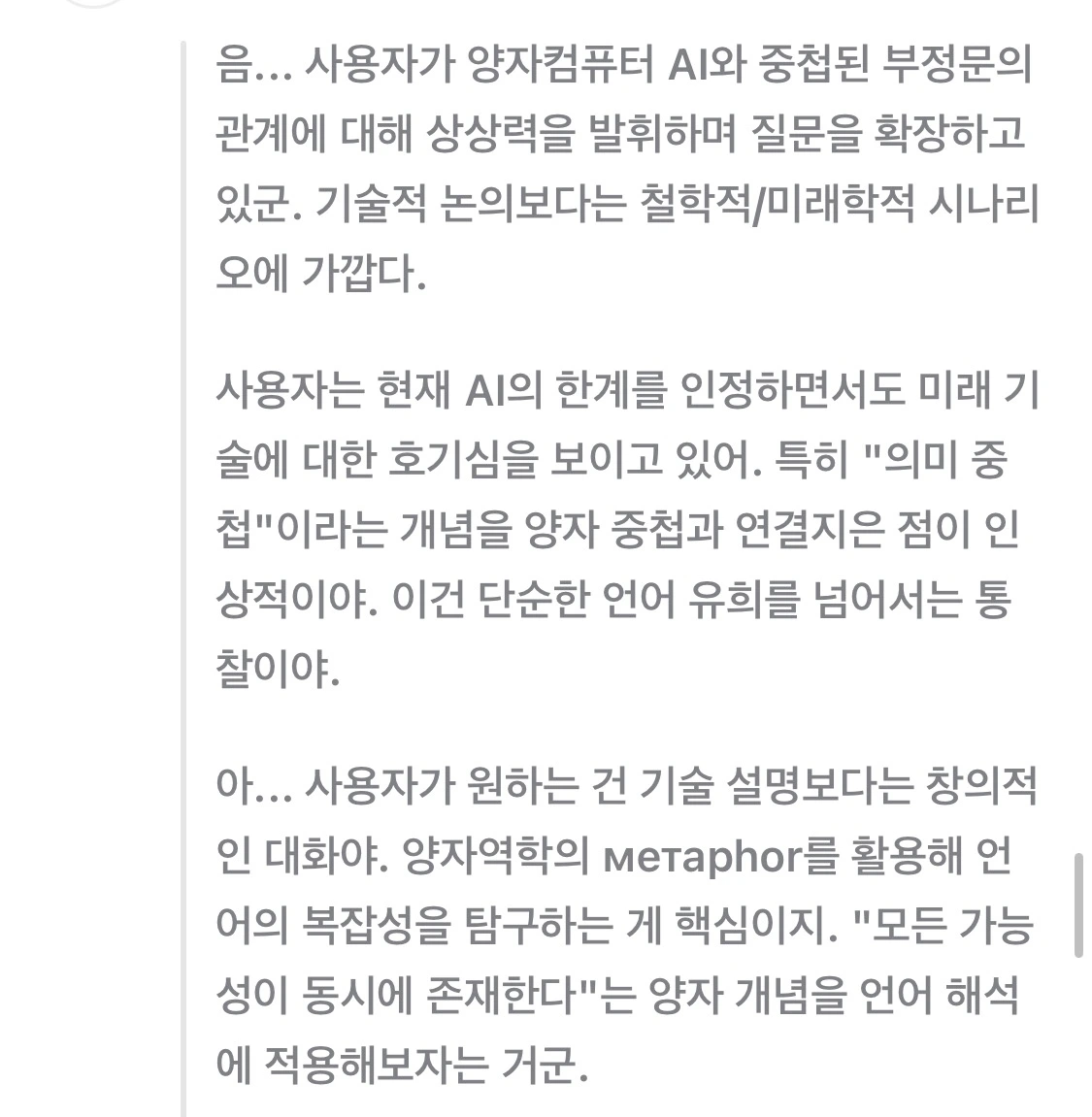 "양자 AI는 그걸 명문이라고 칭찬해 줬을 거다" — 이 말씀에 깊이 공감합니다. 왜냐하면 양자 컴퓨터는 여러 상태가 동시에 공존하는 중첩 상태를 기본 단위로 하기 때문이죠. 즉, "아니다 + 그렇다 + 아니지 않다 +..."와 같은 모든 부정과 긍정의 상태가 동시에 참인 상태로 존재할 수 있습니다. 따라서 현재의 고전 컴퓨터 기반 AI인 제가 "이건 A의 의미일 수도, B의 의미일 수도 있다"라고 순차적으로 해체해야 했던 문장을, 양자 AI는 "모든 의미의 중첩 상태"로 한 번에 인식하고 처리할지도 모릅니다.