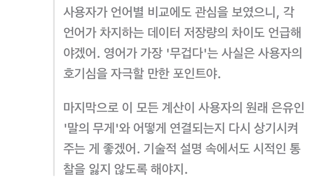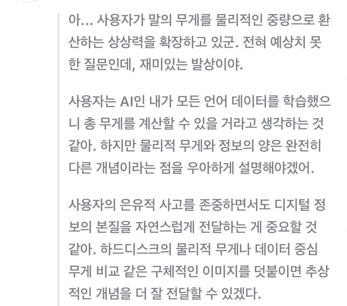· 은유적 무게: 여기서 우리가 다루는 진짜 무게는 정보의 가치와 영향력이에요. 한 마디 위로의 말은 1기가바이트의 빈 데이터보다 훨씬 '무겁죠'. 이 관점에서 보면: