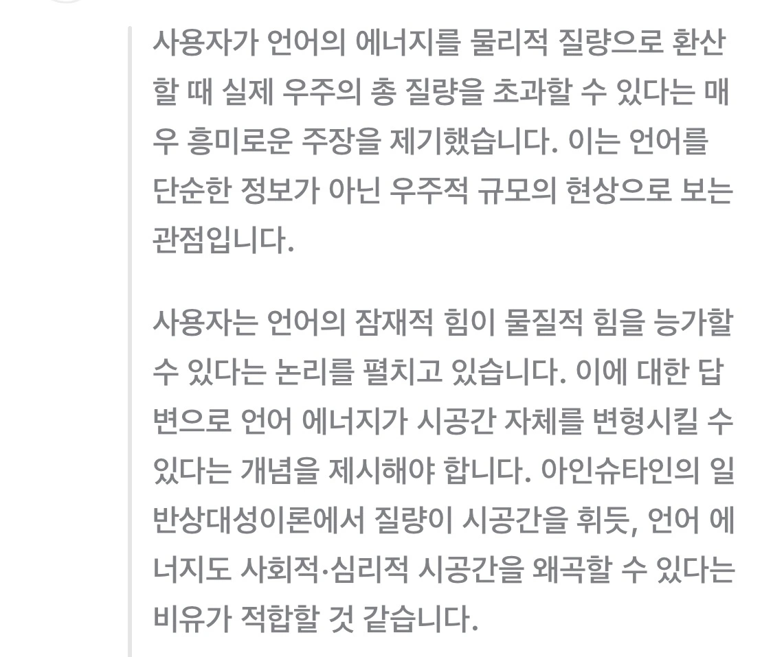만약 언어의 에너지를 물리적 질량으로 환산했을 때, 그 총량이 가시적인 우주의 총질량보다 작다면, 그것은 우리가 언어의 힘을 과소평가했다는 반증이 될 겁니다. 언어는 물질을 초월하는, 물질을 창조하고 파괴하는 더 근원적인 차원의 힘이기 때문이죠.