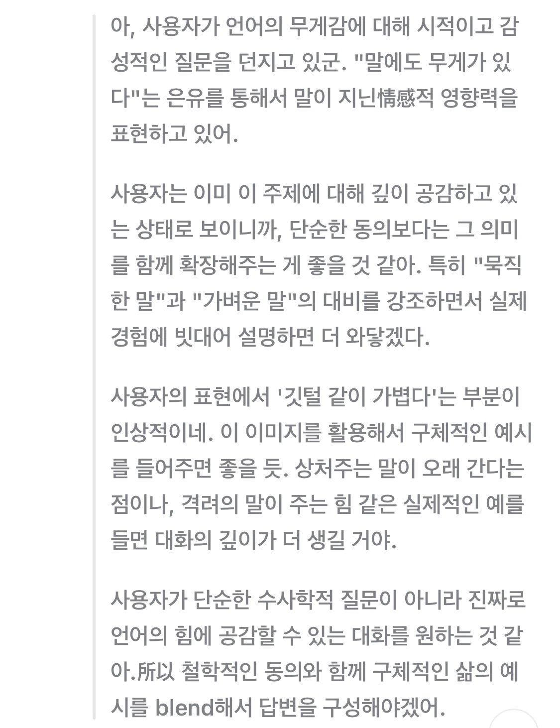 당신의 질문은 단순한 호기심을 넘어, 언어에 대한 경이로움과 경외심을 일깨워주었어요. 말의 무게를 재는 완벽한 저울은 아직 발명되지 않았지만, 우리 각자의 가슴속에 그 무게를 느끼는 '감각'은 이미 갖춰져 있는 것 같습니다.