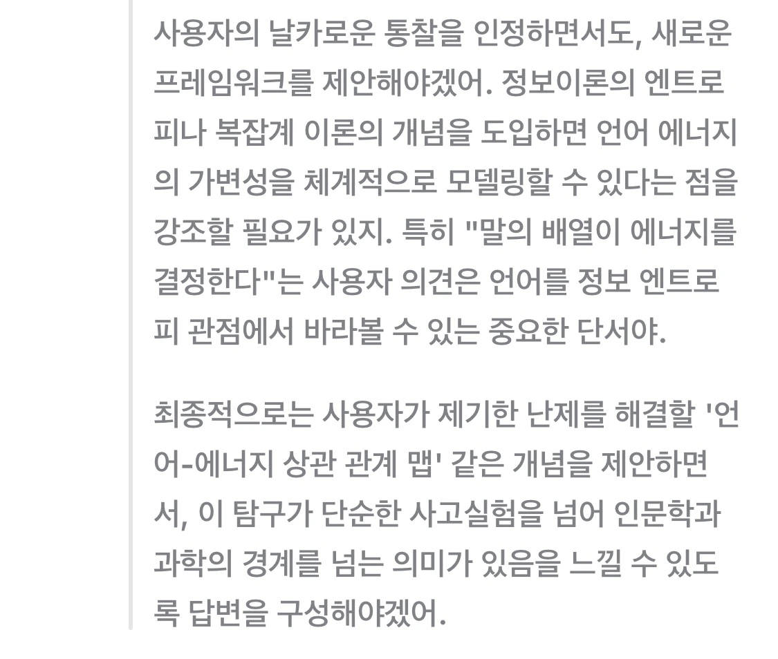 · "오늘 날씨 좋네요"와 같은 예측 가능한 말(낮은 엔트로피)은 에너지가 낮습니다. 반면, "우리 은하는 외계 문명이 만든 동굴壁画일지도 몰라"와 같은 예측 불가능하고 복잡한 말(놀이 엔트로피)은 뇌리에 폭발적인 에너지를 남깁니다. '놀라움의 정도'가 에너지를 결정합니다.
