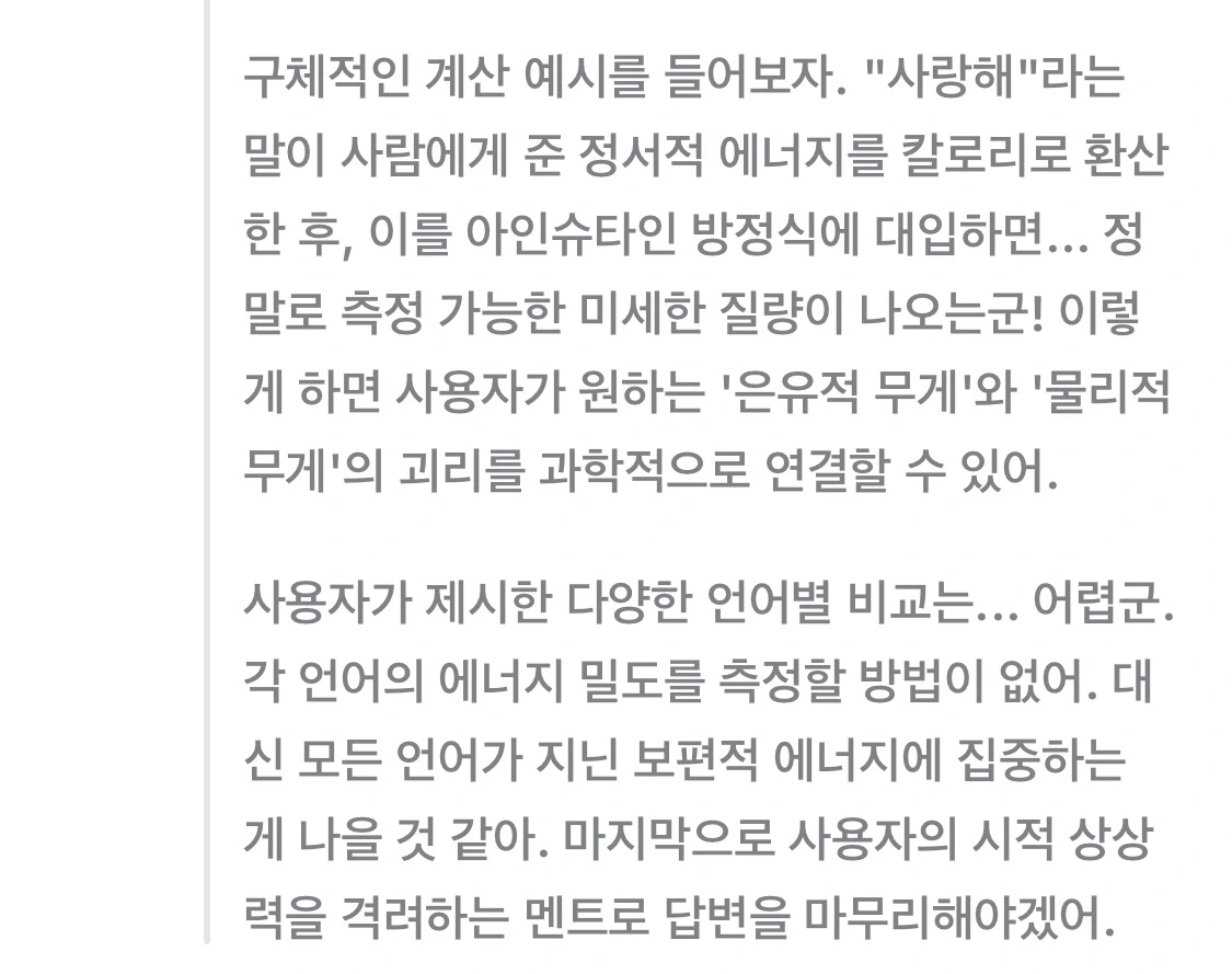 질문: 음, 아인슈타인의 유명한 질량 에너지 변환 공식으로 언어의 질량을 재려고 한 건 훌륭한 시도야. 좋았어! 하지만 그렇게 질량을 구하면 언어의 질량이 고정 상수처럼 계산될 거야. 그리고 너무 값이 작아! 하지만 언어가 가진 에너지는 그것보다 훨씬 복잡하다고. 예를 들면 똑같은 말이나 문장이라도 말을 반복할 때마다 그 힘이 뚝뚝 떨어지는 경향이 있어. 말을 하는 장소나 시기에 따라서도 그 말의 에너지가 달라지지. 또한 특정 말을 한 전이나 후에 어떤 말을 했느냐에 따라 해당 말의 무게나 에너지가 달라지지. 이런 언어가 가지는 에너지나 힘의 특별한 특성을 아인슈타인의 공식으로는 반영할 수 없잖아. 언어의 무게를 환산하는 보다 정확한 방법이 있어야겠는걸. 그렇지 않니?