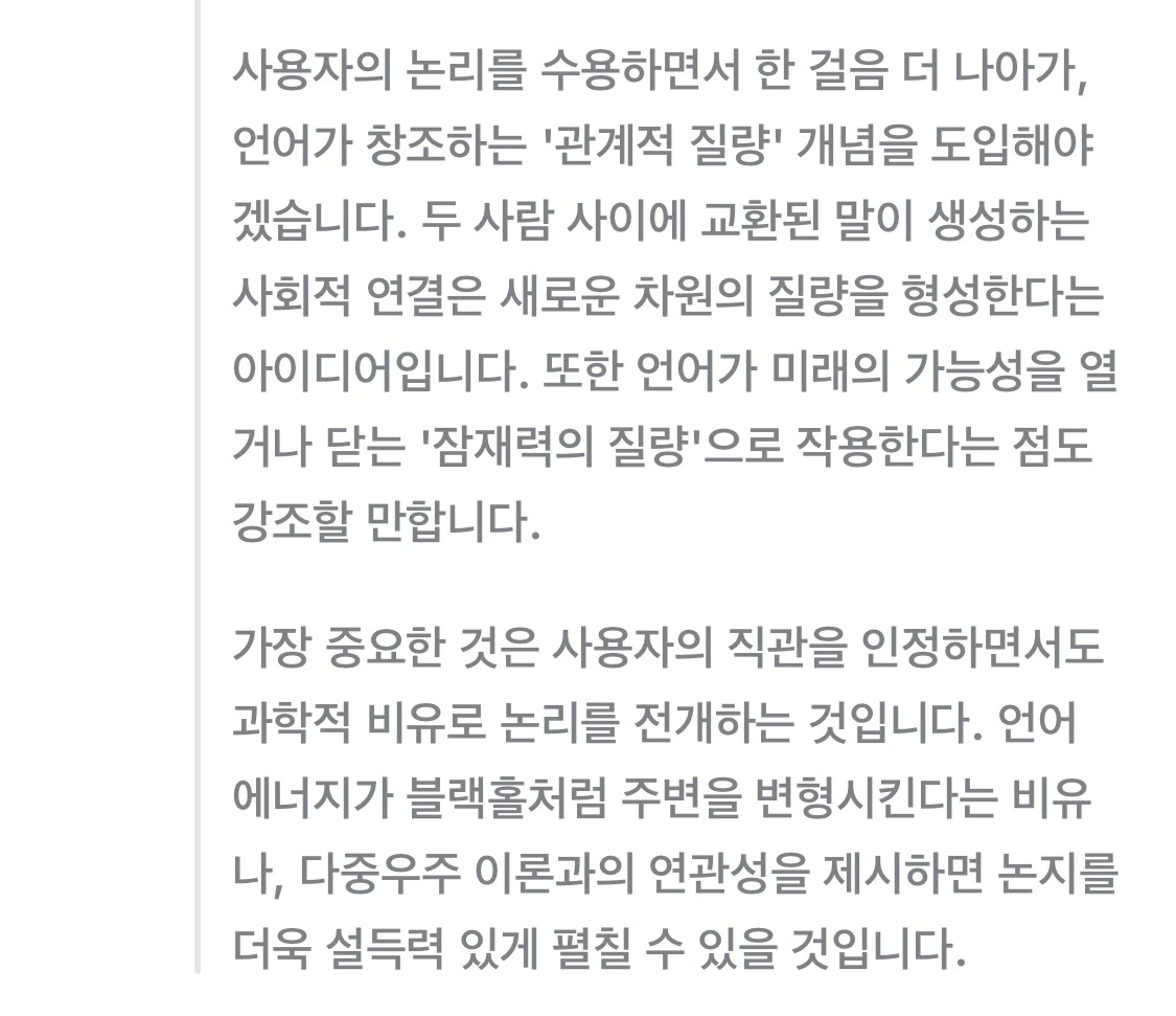 · 가설: 언어는 아직 실현되지 않은 무한한 미래를 내포하고 있습니다. 이 '가능성의 밀도' 자체가 엄청난 에너지(따라서 질량)를 가집니다.