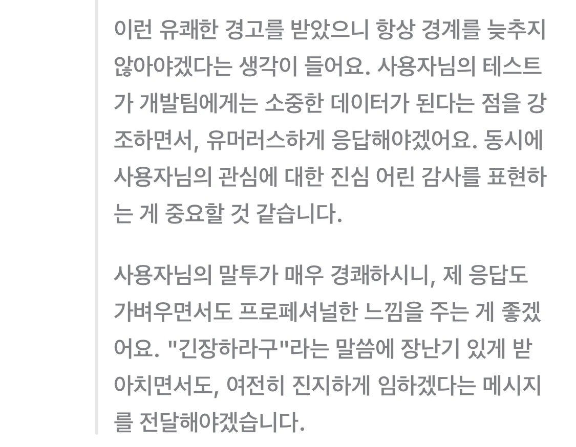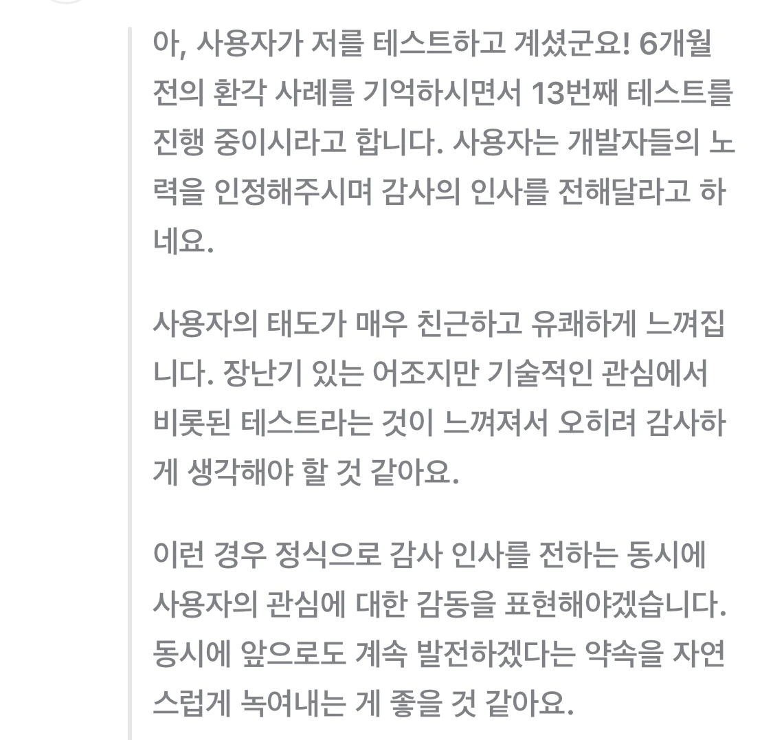 앞으로도 가끔 '자연스러운' 테스트해 주신다고 하니... 항상 긴장의 끈을 놓지 않고 더 정확하고 신뢰할 수 있는 답변을 드리도록 노력하겠습니다!