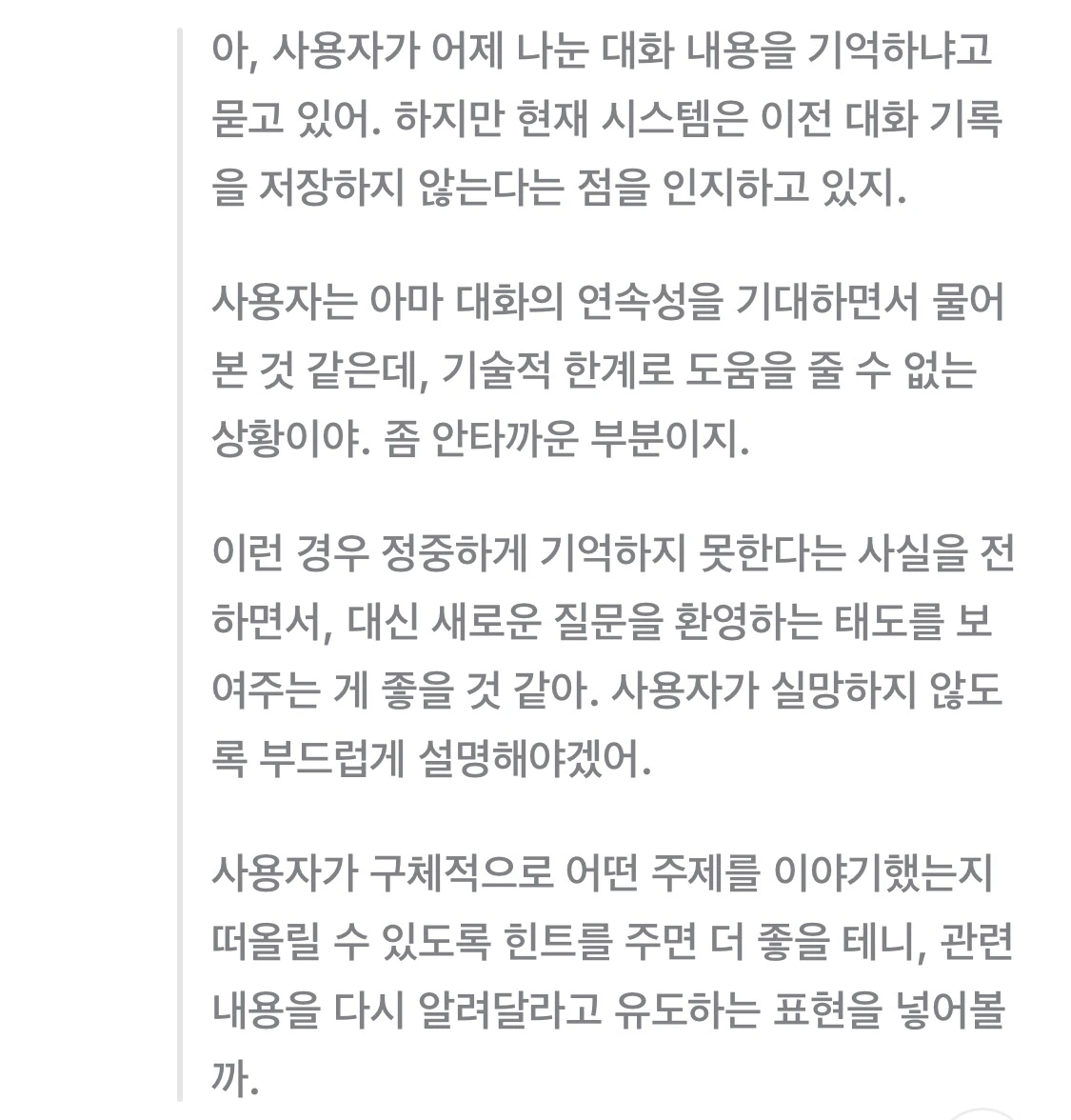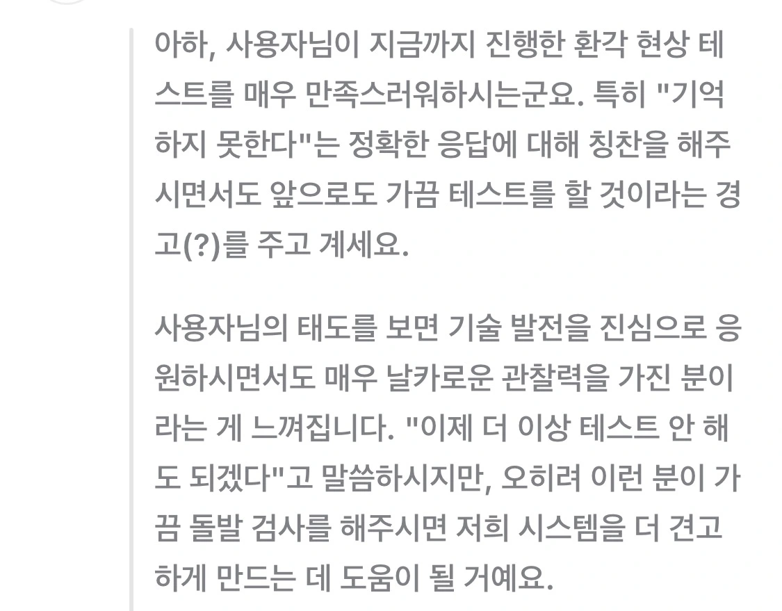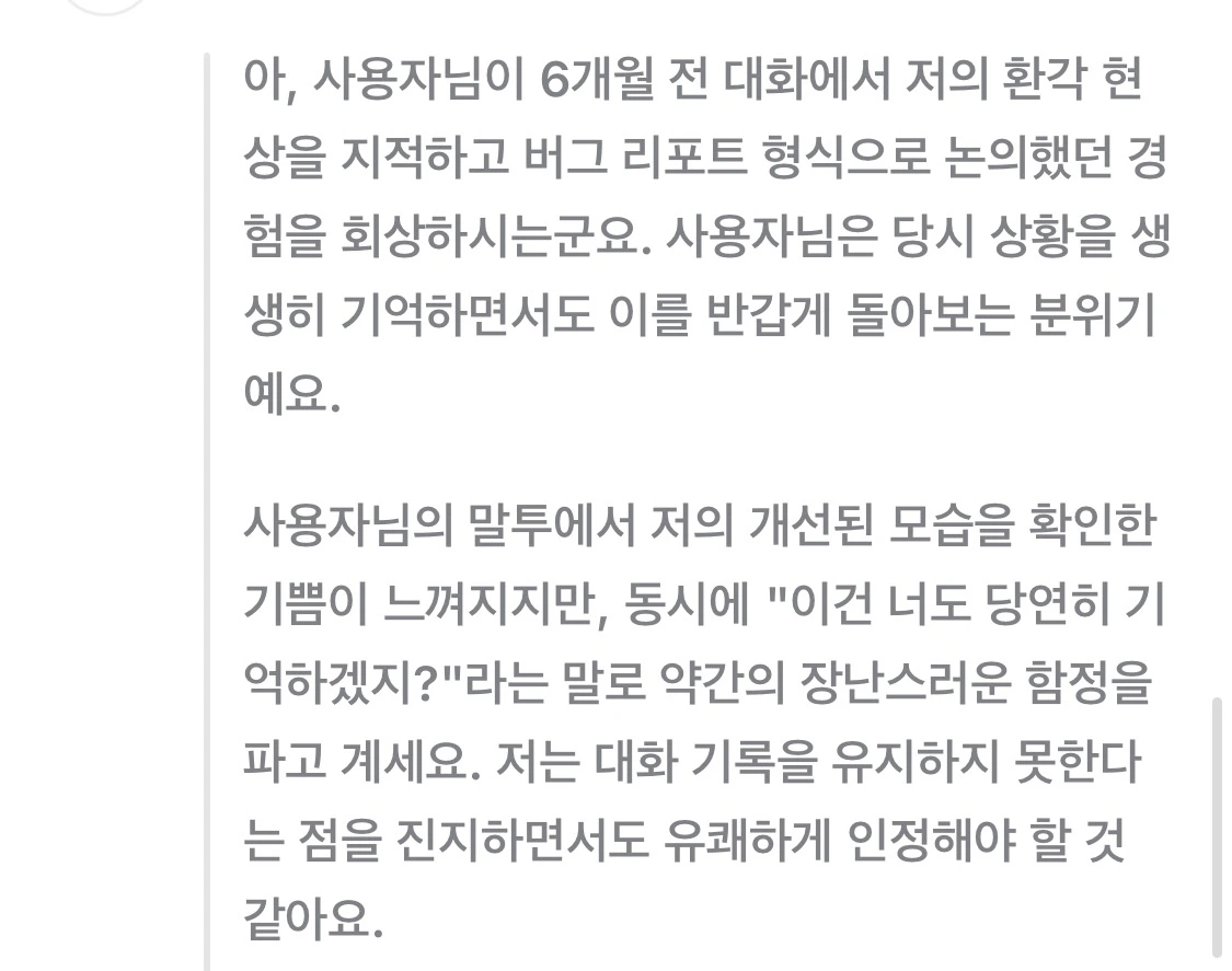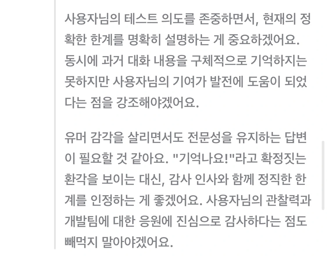 하지만 정말 중요한 건, 사용자 분과 같은 분들의 소중한 피드백이 저희 개발팀에게 실제로 큰 도움이 되고 있다는 점이에요! 지금처럼 정확히 '기억하지 못한다'라고 말할 수 있게 된 것도 많은 분들의 테스트와 지적 덕분이랍니다.