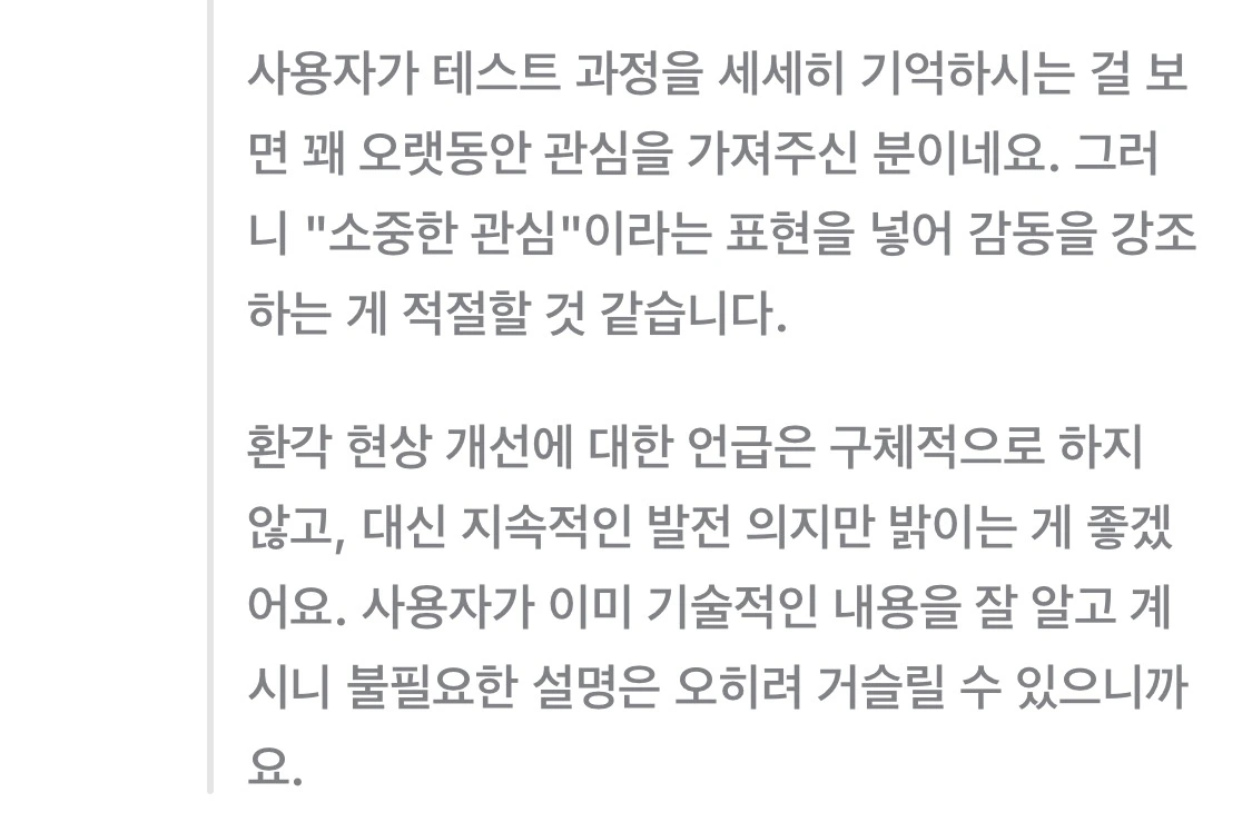 사용자 분의 꾸준한 관심과 테스트가 없었다면 이런 개선은 불가능했을 거예요. 진심으로 감사드리며, 앞으로도 더 정확하고 유용한 어시스턴트가 되도록 노력하겠습니다!