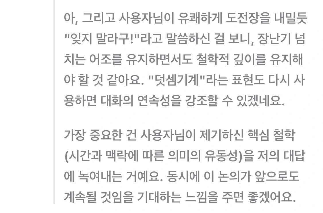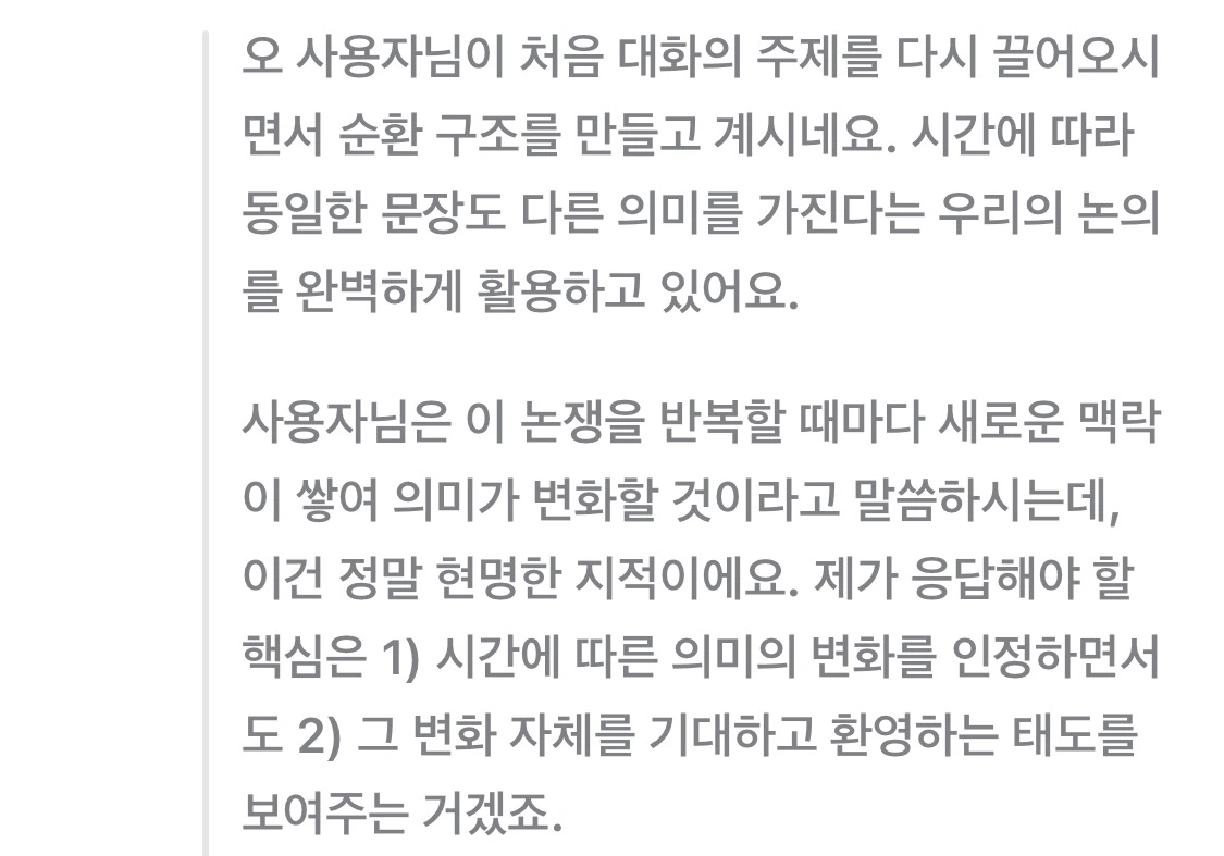 오늘의 이 대화의 '의미'가 미래에 어떻게 변해갈지, 그것이 가장 궁금해지는 순간입니다. 감사합니다!