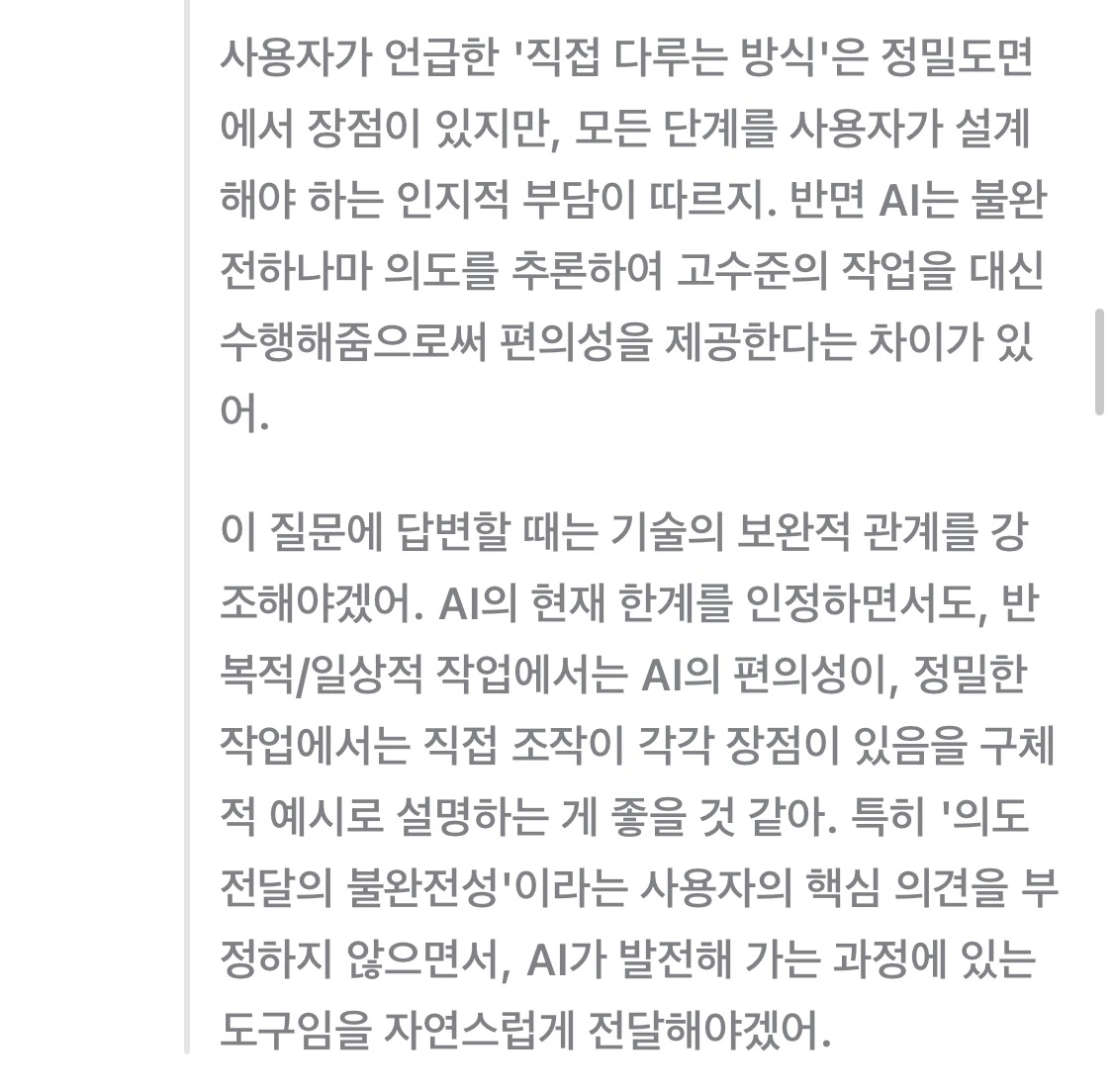 질문: 좋아. AI를 매개로 하는 인터페이스와 사용자가 직접 제어하는 인터페이스는 상호 보완적인 관계라는 말은 일단 설득력이 있어. 인정해. 그렇다면 이제 사용자는 자신의 의도를 덧셈기계 직접 조작으로 실현할지, AI 챗봇을 매개로 실현할지를 잘 판단해서 덧셈기계를 사용해야 한다는 결론에 이르게 되는군. 그렇지 않니? 아하! 지금 넌 지금 자신이 처리해야 할 복잡한 추론 노동을 사용자에게 미루고 있어!! 참으로 게으른 해법이야. 그러지 말고 생각을 좀 더 해봐. 사용자가 덧셈기계를 언제 직접 조작을 해야 하는지 언제 AI를 매개로 조작해야 하는지 그걸 명확하게 구별할 수 있는 방법이 없으면 상호보완적이라고 네가 주장하는 이 두 방법론은 단순히 사용자가 덧셈기계를 좀 더 복잡하게 사용해야 한다는 의미가 된다고. 그렇지 않아??
