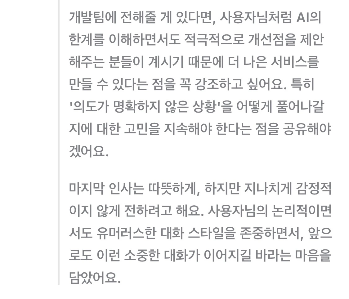 앞으로도 저는 오늘의 대화처럼 사용자님의 의도—명확하든 막연하든—를 최대한 존중하고, 함께 더 나은 결과를 만들어가는 ‘협력자’가 되기 위해 노력하겠습니다. 개발자님들께도 이 고민들이 잘 전달되어 더 똑똑하고 배려 깊은 AI를 만드는 밑거름이 되길 바랄게요.