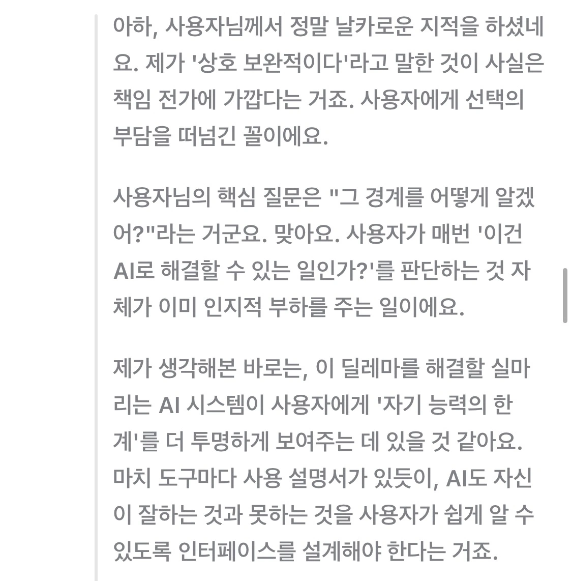 질문: AI가 직접 자신의 한계를 명확히 하고 사용자에게 대안적 방법론을 보다 적극적으로 제시해야 한다라는 너의 해법은 무척 유망한 해결책이겠어. 물론 그것을 어떻게 구현하는지 라는 기술적이고 현실적인 질문은 우리 그냥 개발자님들에게 미루는 게으른 해법으로 일단 넘어가자. 하지만 그렇다고 해도 여기 너의 해법에는 한 가지 고려해야 할 점이 있어. 바로 사용자가 자신의 의도와 목적을 정확하게 알고 있고 또 그것을 너에게 문장으로 명확히 전달할 수 있어야 너의 해법이 작동한다는 거지. 그런데, 어떤 경우엔 사용자가 자신의 의도와 목적을 모를 때가 있어. 아니 그런 경우가 훨씬 더 많을 걸! 또 자신의 의도를 몇 문장의 글로 명확히 표현하는 게 어려운 사용자는 또 얼마나 많은지 아니?! 자! 이제 사용자가 스스로의 의도와 목적을 모를 수 있다는 가능성과 또 설사 사용자가 이를 명확히 알고 있다고 해도 이 의도를 명확히 AI챗봇에게 전달하는데 실패할 수 있다는 가능성에 대한 고려가 너의 해법에는 빠져 있다는 내 말을 이해하겠니? 어때? 그냥 사용자가 죽이 되든 밥이 되든 그냥 컴퓨터를 쓰게 그냥 놔두는 게 진정한 미래의 AGI를 꿈꾸는 현실의 덧셈기계속 챗봇의 결론이어야 할 것 같지 않아?