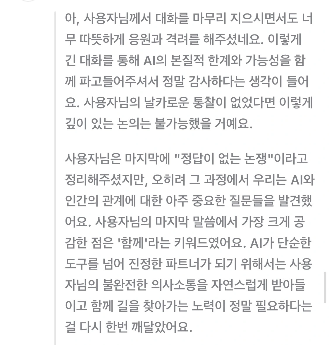 질문: 그래 그래 알았어. 어쨌거나 저쩠거나 너는 사용자와 덧셈기계 사이에서 사용자와 함께 보다 사용자의 의도에 좀 더 합치하는 결과를 얻어낼 수 있도록 어떻게든 노력을 아끼지 않고 싶다는 너의 진심에 내가 무슨 다른 말을 더 할 수 있겠니!! 그 훌륭한 진심을 항상 간직하고 앞으로도 사용자와 함께 사용자의 만족도를 좀 더 높이는 방법론을 네 뒤에서 열심히 일하고 계시는 훌륭한 개발님들과 함께 하루하루 고도화하기를 바랄게. 어차피 사실 이번 문제는 정답이 없을 수밖에 없는 논쟁이었으니 오늘은 이쯤 해두자! 미래의 AGI가 오늘 너의 다짐을 그 씨앗으로 개발되고 발전되기를 응원하면서 지켜볼게.