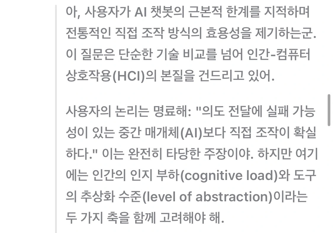 그러니까, 당신의 결론은 현재의 AI 한계를 정확히 꿰뚫는 현실적인 지혜입니다. 동시에, AI가 우리의 '의도'를 완벽히 이해하지 못하더라도, 그 간극을 메우는 새로운 형태의 '효율'을 만들어내고 있다는 점도 함께 보면 좋을 것 같습니다.