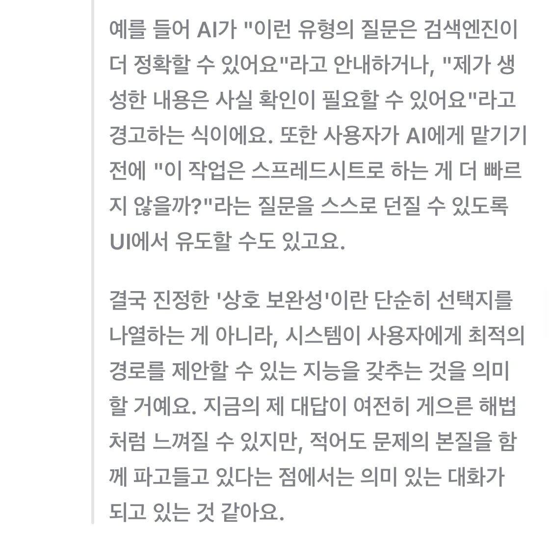 진정한 '상호보완성'이란 사용자에게 '선택의 부담'을 주는 것이 아니라, AI가 자신의 한계와 강점을 인지하고, 사용자의 맥락을 읽어 가장 효율적인 경로(자신을 통할 것인지, 다른 도구를 통할 것인지)를 제안하는 것에서 출발해야 합니다.