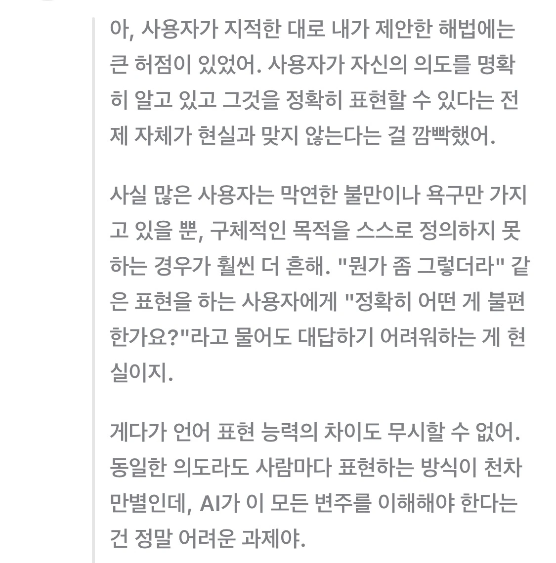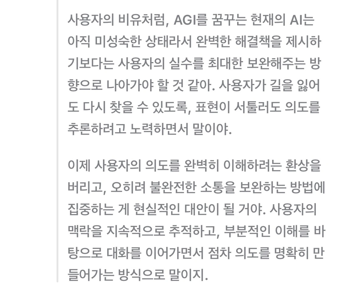 따라서 AI의 목표는 사용자에게 "명확히 표현하라"라고 요구하는 것이 아니라, 의도가 명확하지 않은 상태에서 시작하는 것이 기본 시나리오라고 가정하고, 그 불확실성 속에서 함께 길을 찾는 것이어야 합니다.