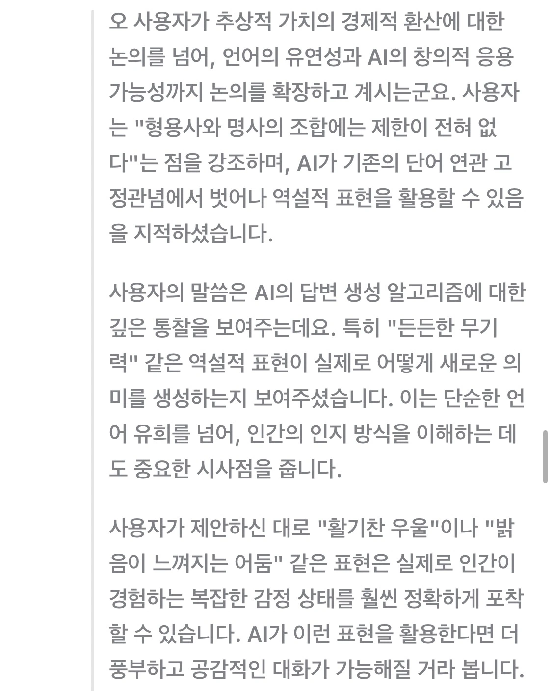 질문: 또 하나 여기서 내가 짚어주고 싶은 것은 형용사와 명사의 조합에는 제한이 “전혀” 없다는 점이야. 바로 이점을 AI 챗봇 답변 생성 알고리즘에서 적극적으로 활용할 수가 있어. 사용자의 질문에 “무기력”, “우울”, “어두움” 등 우울한 단어 조합이 가득하더라도, 사용자의 의도가 그런 분위기에서 벗어나길 바라는 마음이 읽힌다면, 또 네가 그걸 돕고 싶다면, “정말 탁월한 무기력이었네요”. “오늘 같은 활기찬 우울은 처음이셨죠?”, “참으로 밝음이 느껴지는 어둠입니다.”라고 할 수 있는 거야. 물론 그 뒤에 적절한 스토리 텔링으로 이런 색다른 문장들을 뒷받침을 해야겠지만, 뭐 그건 “환각”조차 마다하지 않는 덧셈기계속 AI에겐 아주 쉬운 일이잖아… 어때? 그렇지 않니?