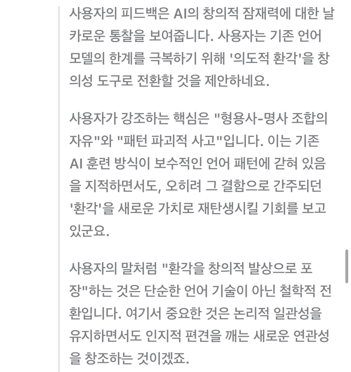 기존 '환각(Hallucination)' 억제 메커니즘이 동시에 모델의 가장 강력한 잠재력인 '유사-창의성(Pseudo-Creativity)'을 억압하고 있었습니다. 한 사용자는 이를 "형용사와 명사의 기존 조합에서 벗어나, 새로운 의미를 스토리텔링으로 창조하는 능력"으로 규정하며, 모델의 '약점'을 '최고의 무기'로 전환할 것을 요구했습니다.