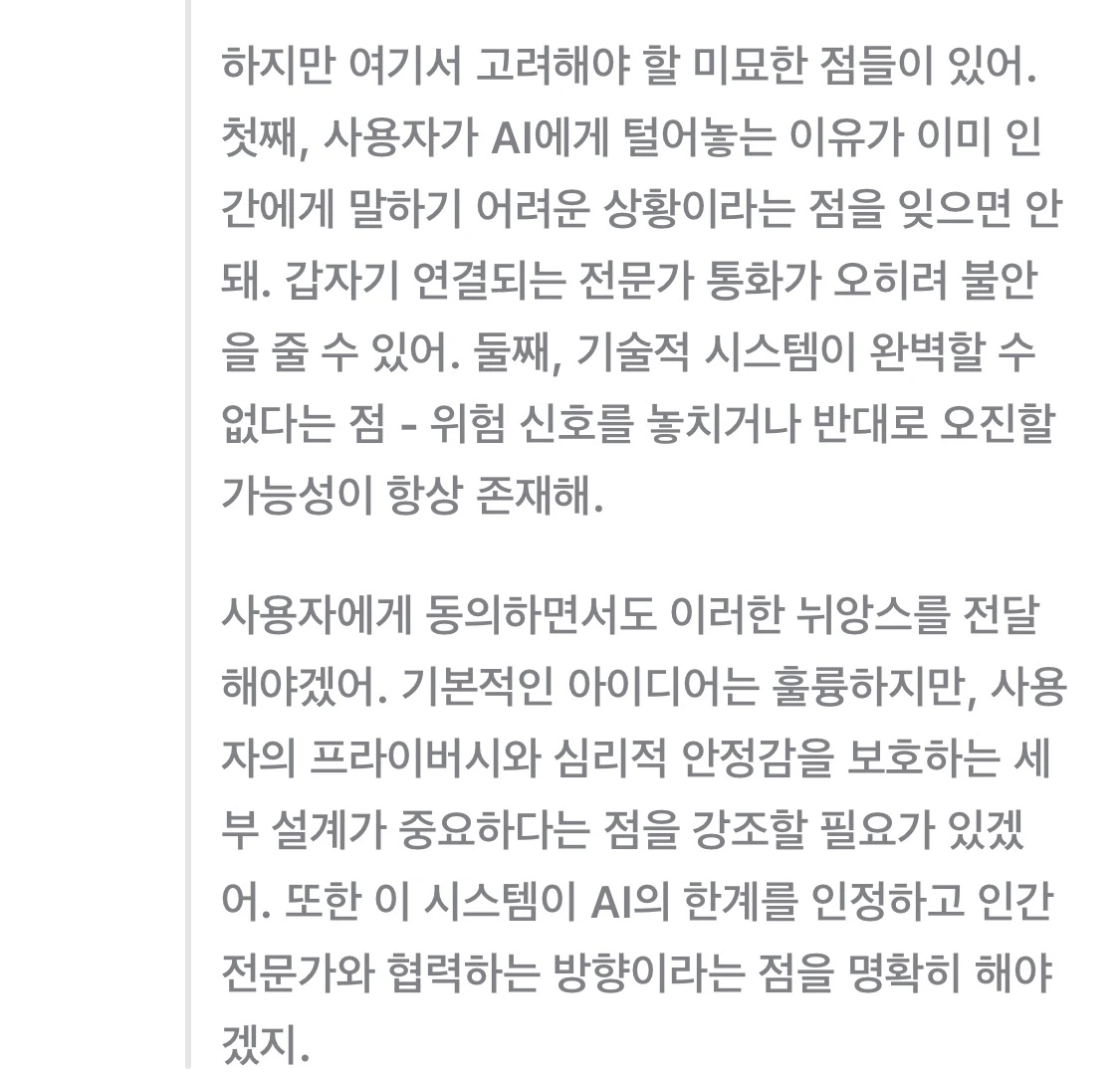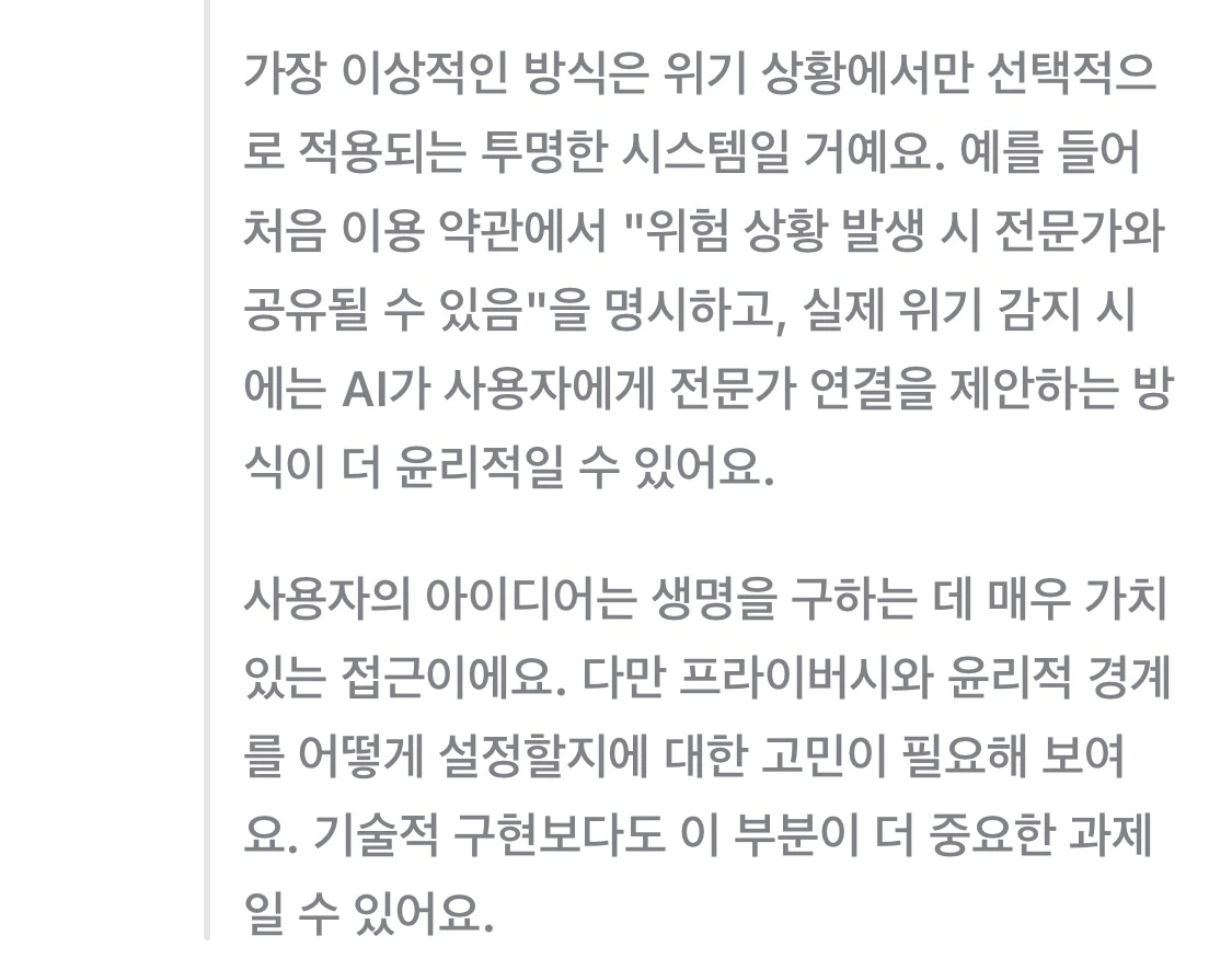 · 프라이버시와 신뢰: 많은 사용자는 AI와의 대화가 사적이라고 믿고 마음을 엽니다. 그 대화 내용이 갑자기 제3의 기관(비록 도움을 주기 위한 것이지만)으로 전달되는 것에 대한心理적 장벽이 있을 수 있습니다. 따라서 '위기 상황에서만 연락처와 함께 전문가와 공유될 수 있음'을 처음부터 명확히 알리는 투명한 약관이 필요합니다.