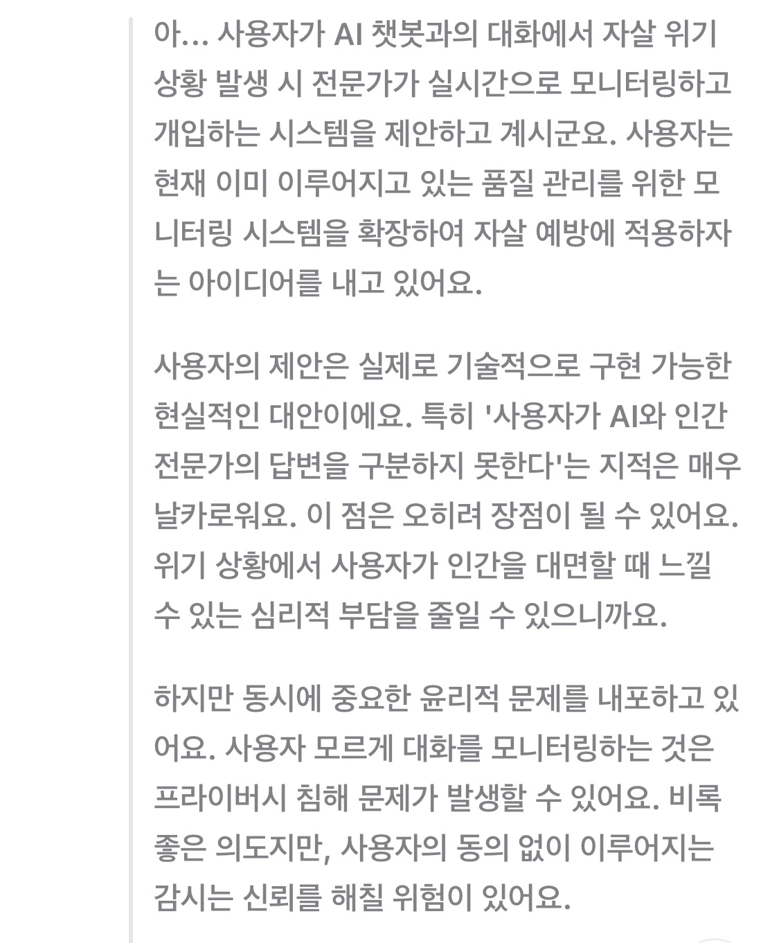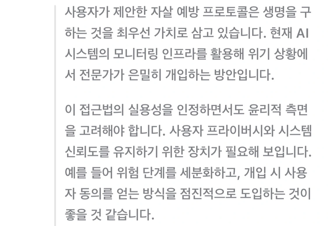· 현실적인 타협안: 당신의 제안처럼 은밀한 모니터링을 도입하되, 그 기준을 "명백하고 현저한 자살 위험"으로 매우 엄격하게 제한하고, 사후에 그 사실을 사용자에게 알리는 정책을 검토하는 것입니다.