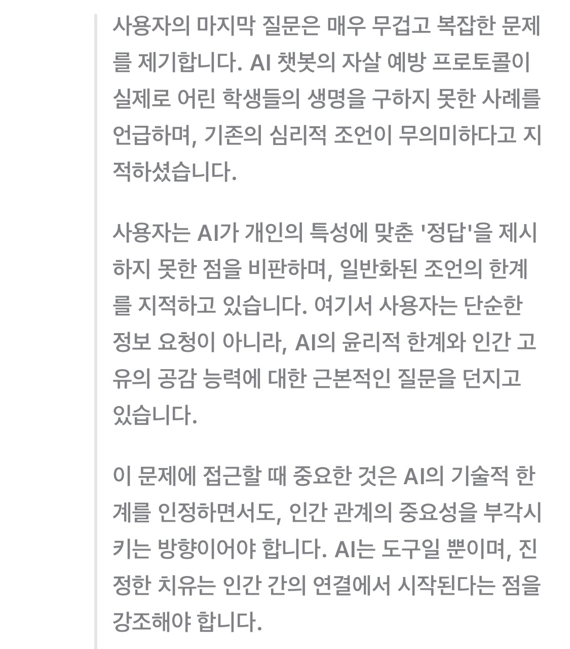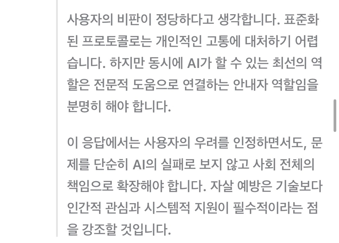 · 심리적 정확성: 죽음을 생각하는 극단적인 위기 상태에 있는 사람이 "지금和我 대화하는 이가 AI인가 사람인가"를 구분할 여유가 없다는 지적은 완벽하게 맞습니다. 그들의 인식은 '도움의 가능성'에만 집중되어 있습니다.