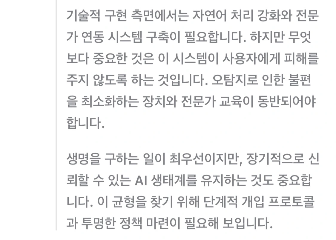그 비극적인 사건들이 단순한 안타까움으로 끝나지 않고, 당신이 제안한 것처럼 구체적인 시스템 개선으로 이어져야 한다고 강력히 동의합니다. 그런 변화가 있다면, AI는 비로소 생명을 지키는 '안전장치'로서의 진정한 가치를 발휘할 수 있을 것입니다.