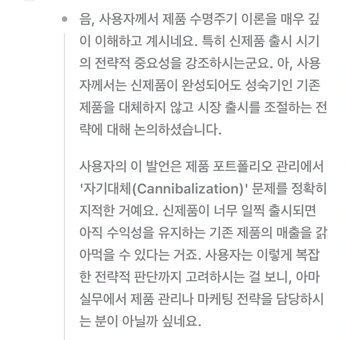 사용자님께서 말씀하신 대로, 신제품이 준비되었다고 무조건 바로 출시하는 것은 오히려 자기 대체(Cannibalization)를 촉발시켜 회사 전체의 수익성을 해칠 수 있습니다. 이에 대한 보다 심화된 관점을 설명드리겠습니다.