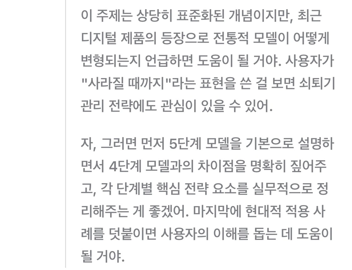 따라서 최고의 의사결정자는 "신제품이 준비된 시점"이 아니라, "시장과 회사의 포트폴리오가 신제품을 필요로 하는 시점"에 출시하는 것입니다. 이것이 바로 수명주기 이론이 제시하는 가장 실용적인 지혜입니다.
