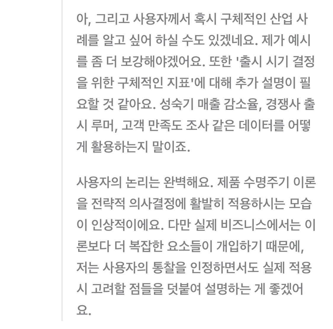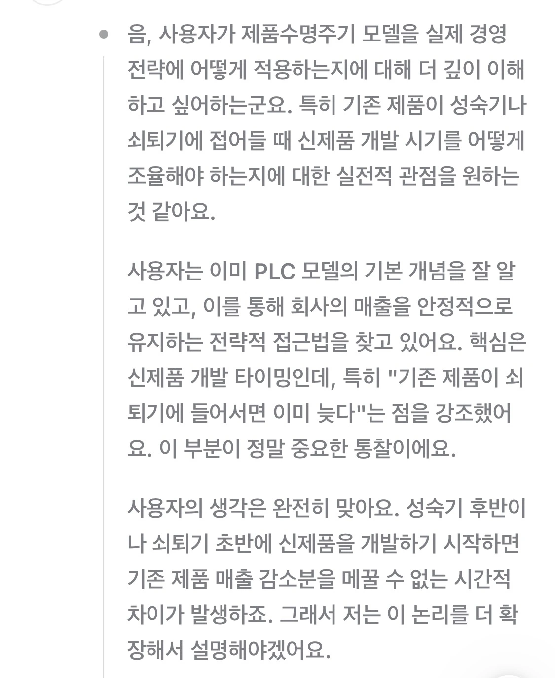 질문: 그래 맞아. 그리고 또 한 가지. 만약, 새 제품의 개발이 이미 마친 상태에서 언제 이 새 제품을 시장에 도입할 것인가를 결정하는 지표도 바로 이 제품 성장주기 단계야. 이미 기존 제품을 대체할 새 제품을 개발을 마쳤다 하더라도 기존 제품이 수명주기 단계상 여전히 성숙단계에 있다면 기존 제품을 계속 팔면서 새 제품의 도입을 늦추는 것이 합리적이야. 왜냐하면 새 제품 도입 그 자체가 원인이 되어 기존 제품이 쇠퇴기에 들어갈 수가 있거든 이건 회사의 장기적 매출성장 관점에서 좋지 않은 선택이야.