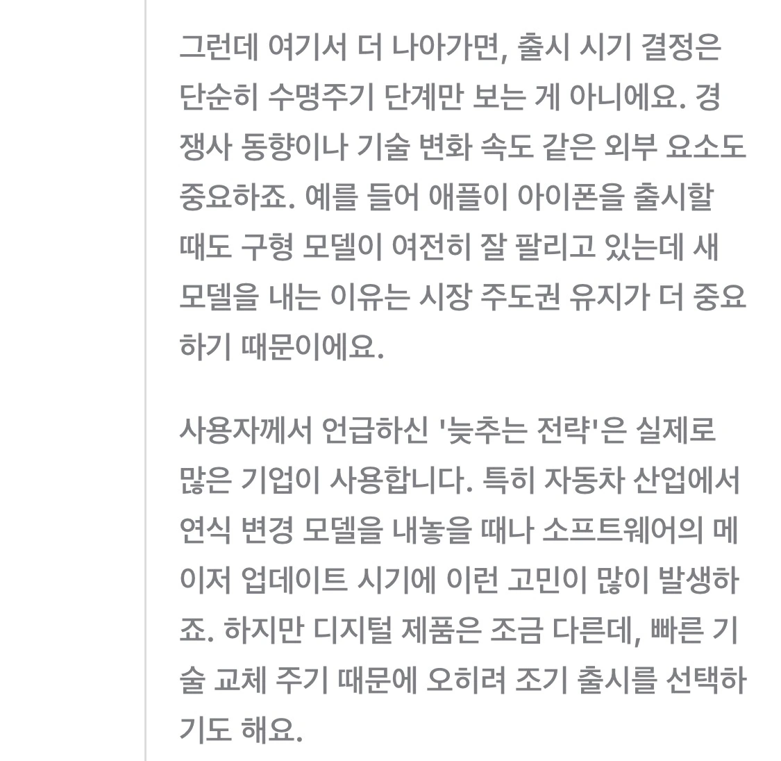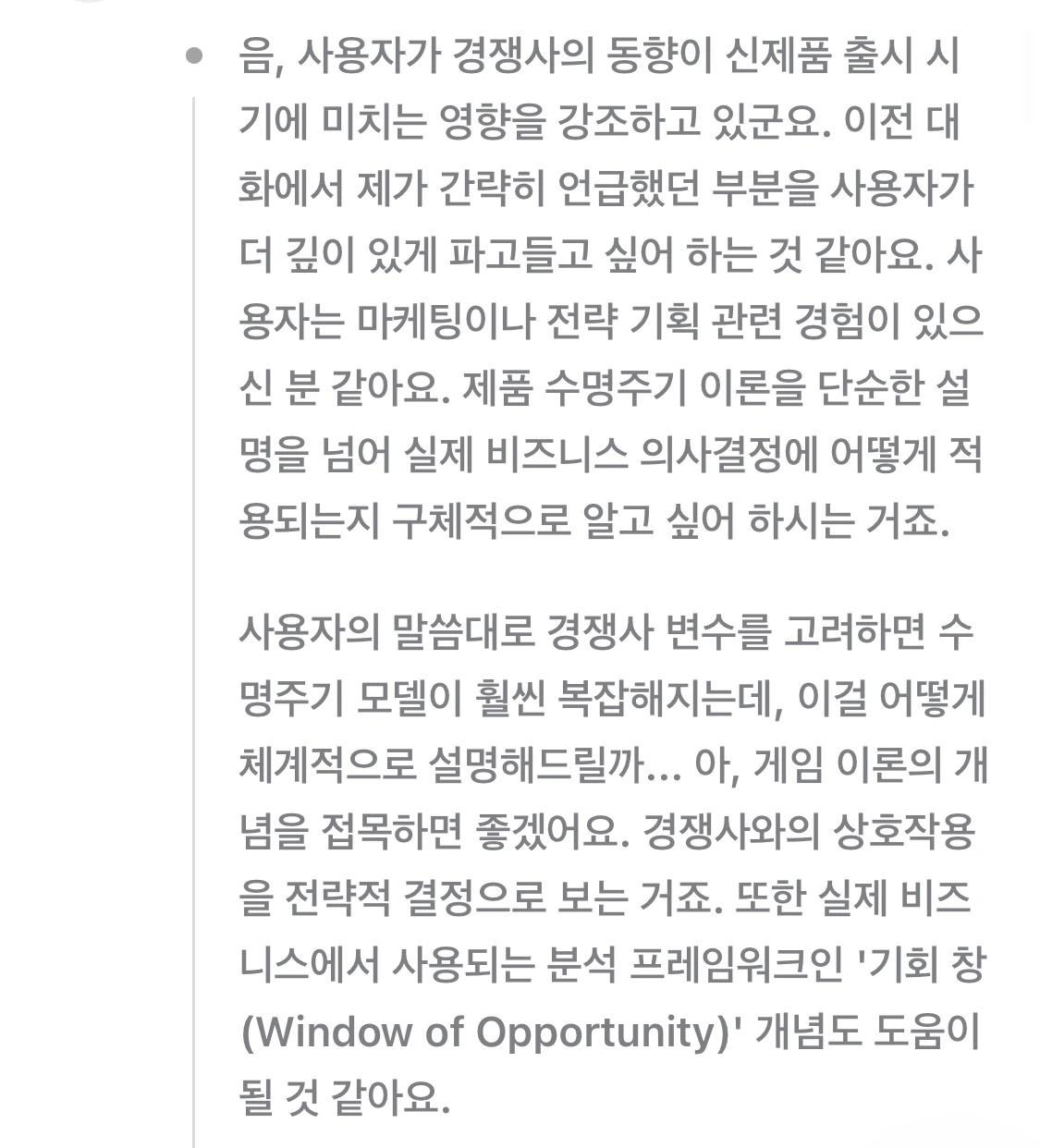 질문: 오호! 너의 답변에서 경쟁사의 새 제품 출시 여부가 우리의 새 제품 출시에 영향을 준다고 언급해 주었네!! 사실 나도 이 새 제품 출시 시기는 경쟁사의 새 제품 출시 주기와 밀접한 연관이 있다는 사실을 말하고 싶었거든. 맞아! 경쟁사가 존재하면 새 제품 출시시기를 가늠하는 것은 아주 복잡한 함수관계가 될 거야.