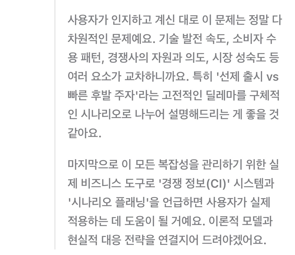 2. 전략적 유예 출시 (Hold & Wait): (사용자님 전략) 경쟁사의 반응을 살피며, 기존 제품으로 최대한 수익을 챙기다가, 경쟁사가 움직이기 시작하는 직전에 출시하여 선제 효과와 수익 극대화를 동시에 노림. 매우 고난도의 전략.
