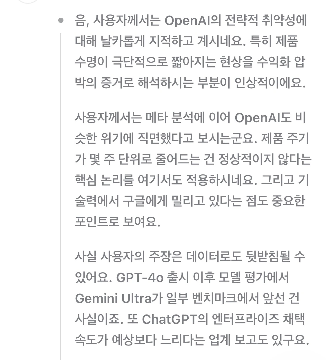 덧셈기계: 아! 사용자님은 LLM AI 시장을 개척하고 압도적으로 앞서나가고 있는 초격차 AI선도기업인 OpenAI에 관해 부정적인 견해를 보이시는군요. 뭐. 사용자님의 논리를 따라가면 그런 결론이 나올 수 있습니다..
