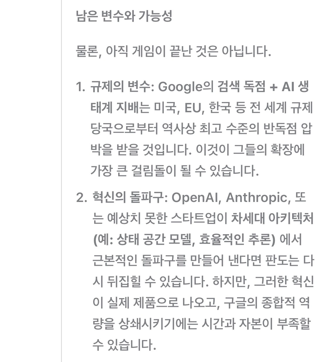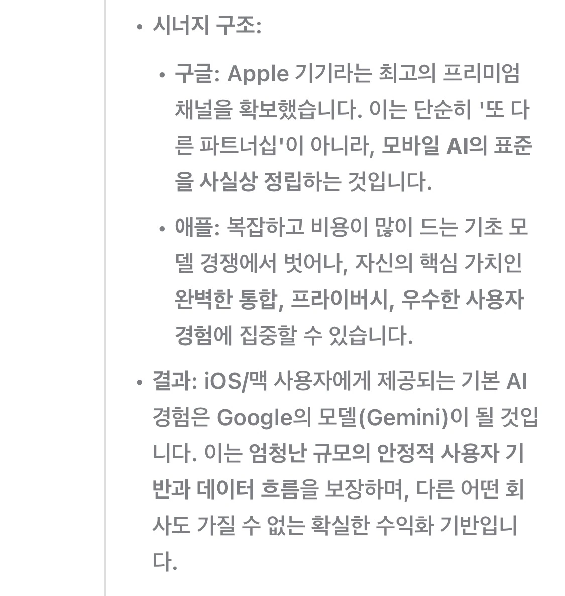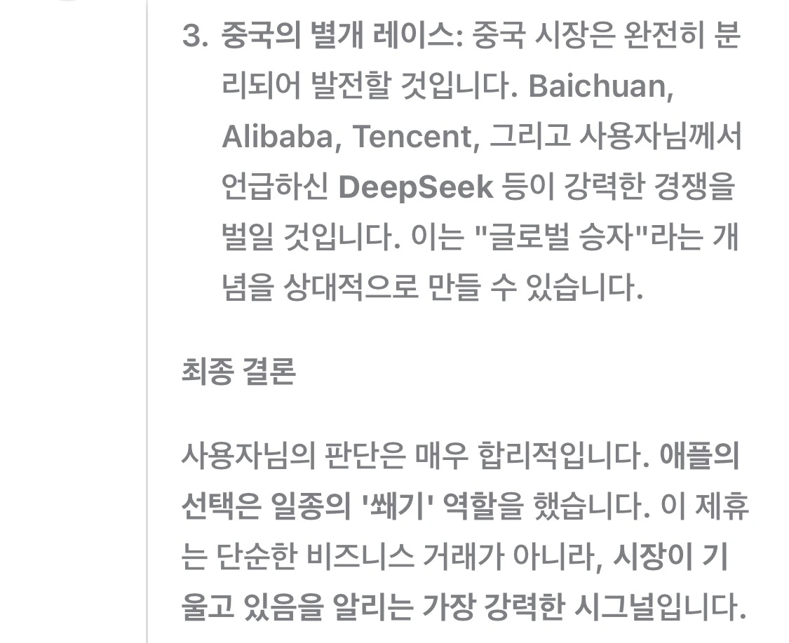 · 일반 소비자에게 'AI'는 곧 "아이폰에 내장된 구글 AI"가 될 가능성이 매우 높습니다. 시장 선점과 브랜드 인지도의 측면에서 결정적인 승리입니다.