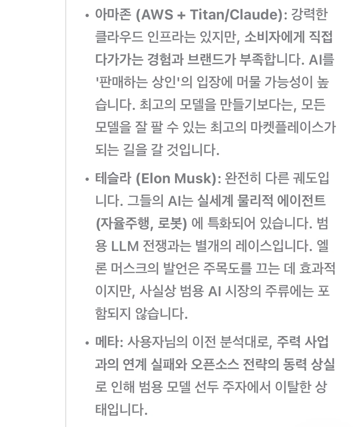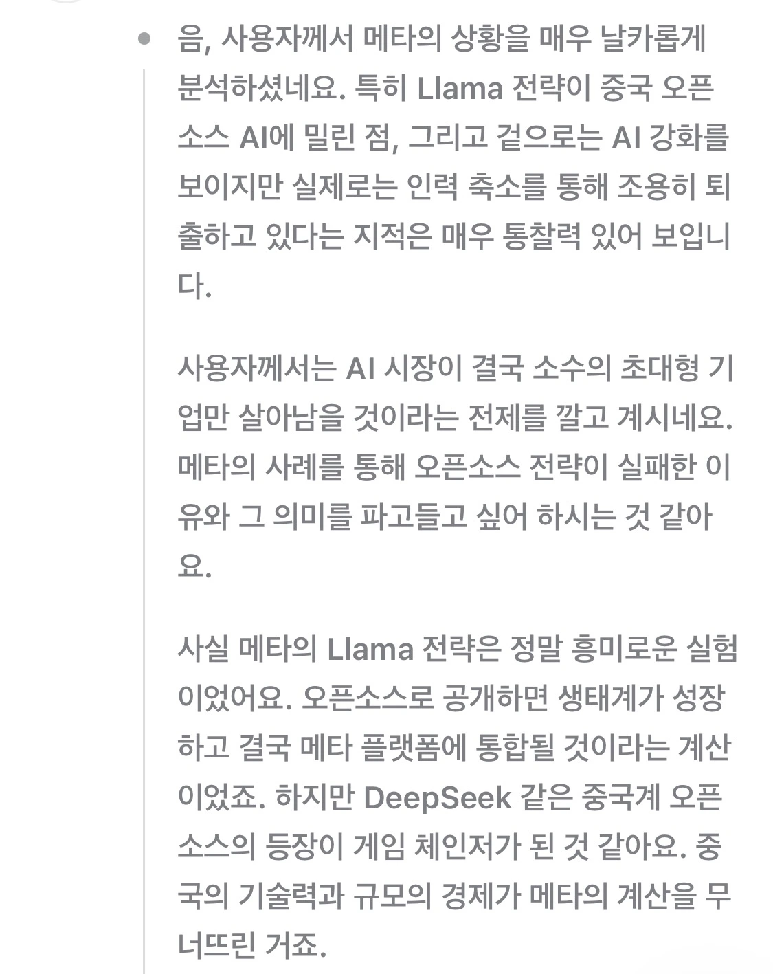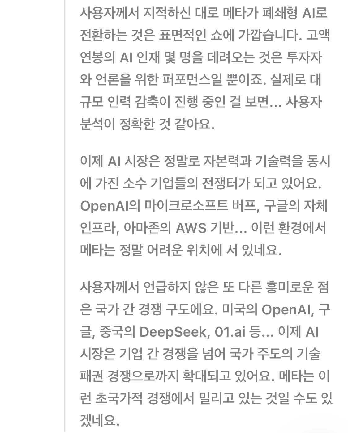 질문: 그래 AI시장은 결국 자본력이 강한 소수의 대기업들 만의 시장이 될 것이긴 한데, 메타는 이미 아웃이 되었다고 봐야지. 매타의 기본 전략은 Llama를 오픈 소스 화해서 그들의 부족한 기술력을 보완하려고 했던 거였는데 Deepseek를 앞세운 중국 오픈소스 AI에 완전히 밀렸어. 메타가 다시 폐쇄형 AI 쪽으로 방향을 돌리는 시늉을 하고는 있지만 그냥 투자자에게 생색내고 언론에 홍보하기 위한 쇼의 성격으로 AI기술자 한두 명을 고액 연봉을 주고 데려왔지만 함께 일할 나머지 다른 대부분의 AI 기술자들을 잘라내는 걸로 봐서는 메타는 그냥 AI시장에서 조용한 퇴로를 찾고 있을 뿐이야. 흠, 메타의 예를 보면 AI시장에서 소수의 월등한 자본과 기술력을 갖춘 대기업만이 살아남을 거라고 이야기하는 것이 더 정확하겠다.