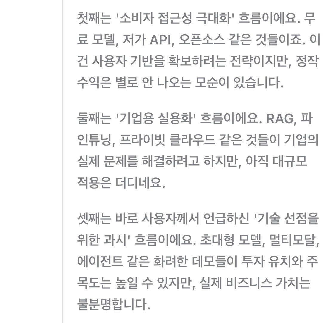 · 하지만 기업이 진짜로 원하는 것은 안정적이고, 예측 가능하며, 통제 가능하고, 비용 대비 효과가 명확한 도구입니다. OpenAI의 빠른 변화와 모델 도태는 기업의 신뢰를 훼손합니다. "지금 도입한 모델이 6개월 후에도 지원될까?"라는 불안감은 B2B 판매의 가장 큰 장벽입니다.