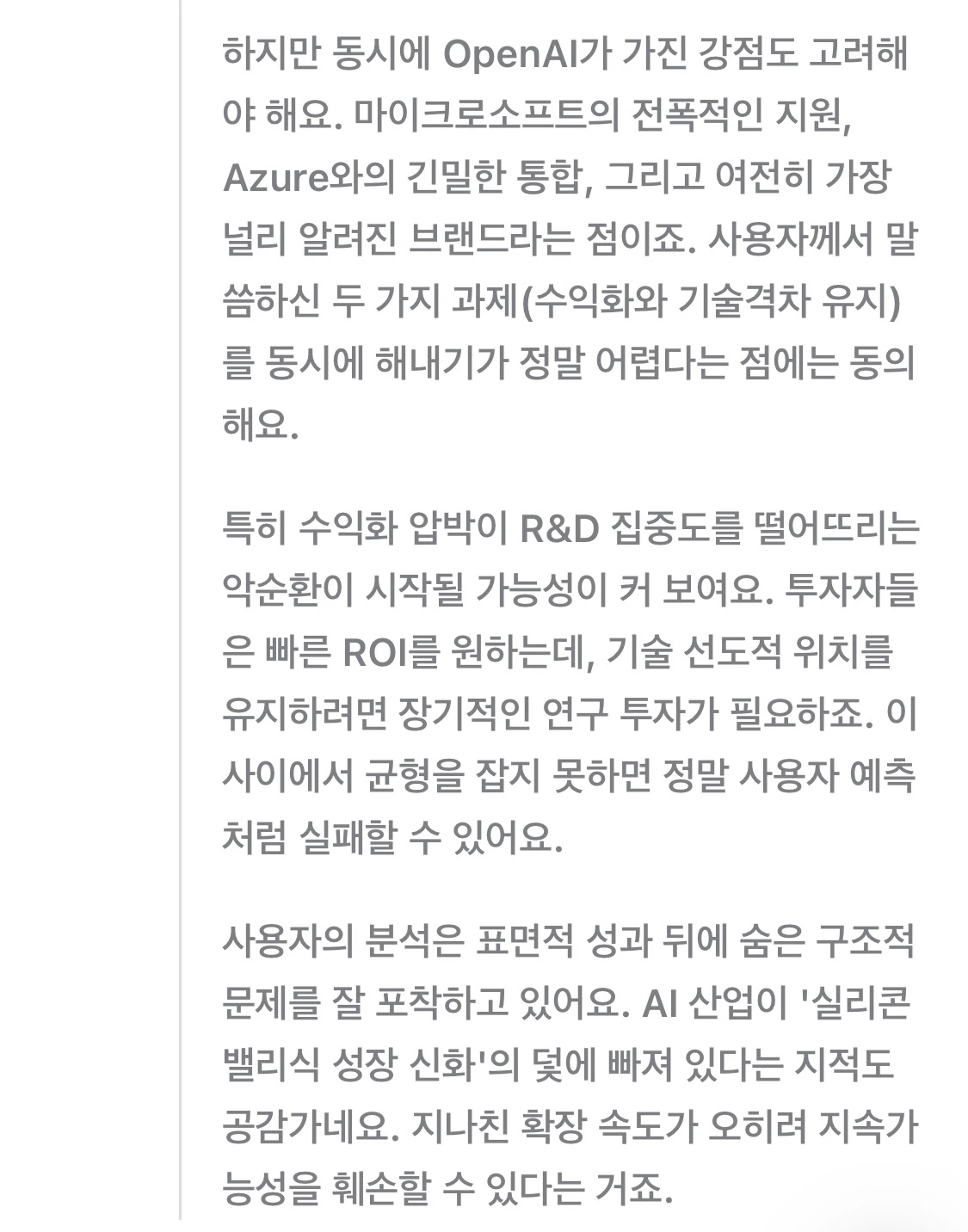 · 수익화가 지연되고, 투자자 인내심이 바닥나며, MS의 지원에도 한계가 오면 내부적 축소와 위기가 올 수 있습니다.
