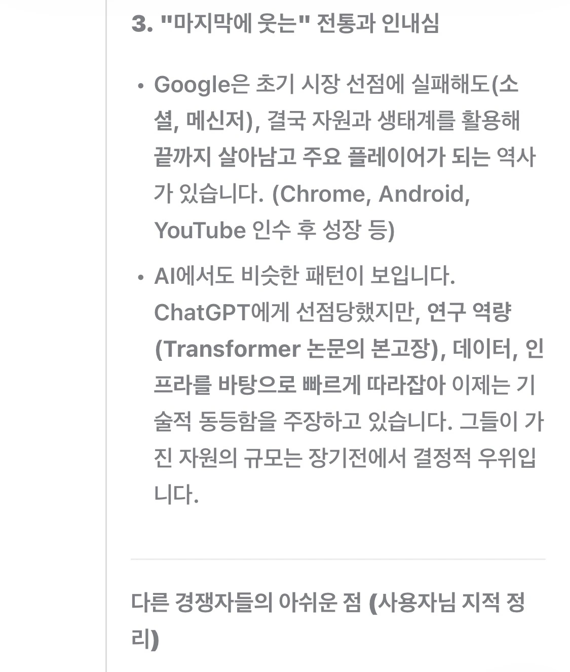 · 반대로, 구글은 검색, 맵, 유튜브 등 이미 구축된 긴밀한 협력 관계, 그리고 안정적인 인프라와 지원 체계로 신뢰를 얻었습니다.