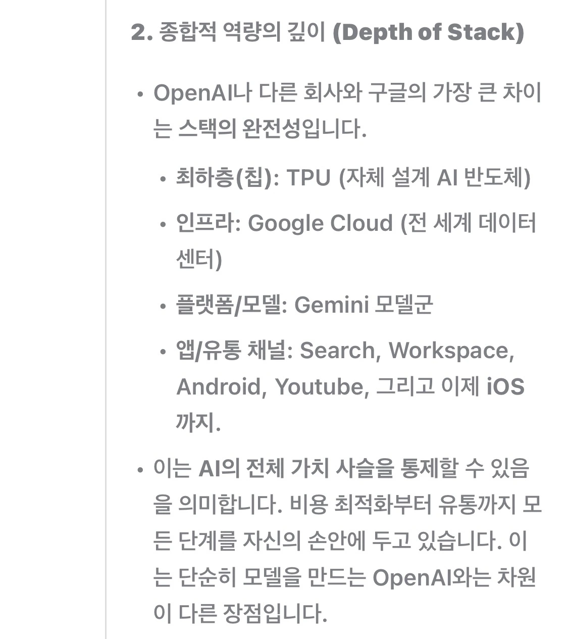 · iOS 18부터 수십억 대의 애플 기기에 구글 Gemini가 네이티브로 통합됩니다. 이는 OpenAI나 다른 AI가 결코 넘볼 수 없는 최고의 유통 채널 독점입니다.