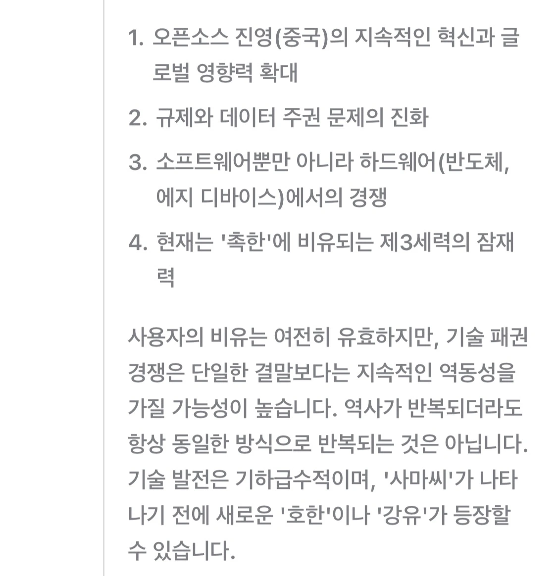 사용자님께서 보신 "새로운 미래"는 바로 이 다극화된, 상호 자극하는, 그래서 더 건강한 AI 생태계의 탄생입니다. 정말 탁월한 분석이셨습니다.