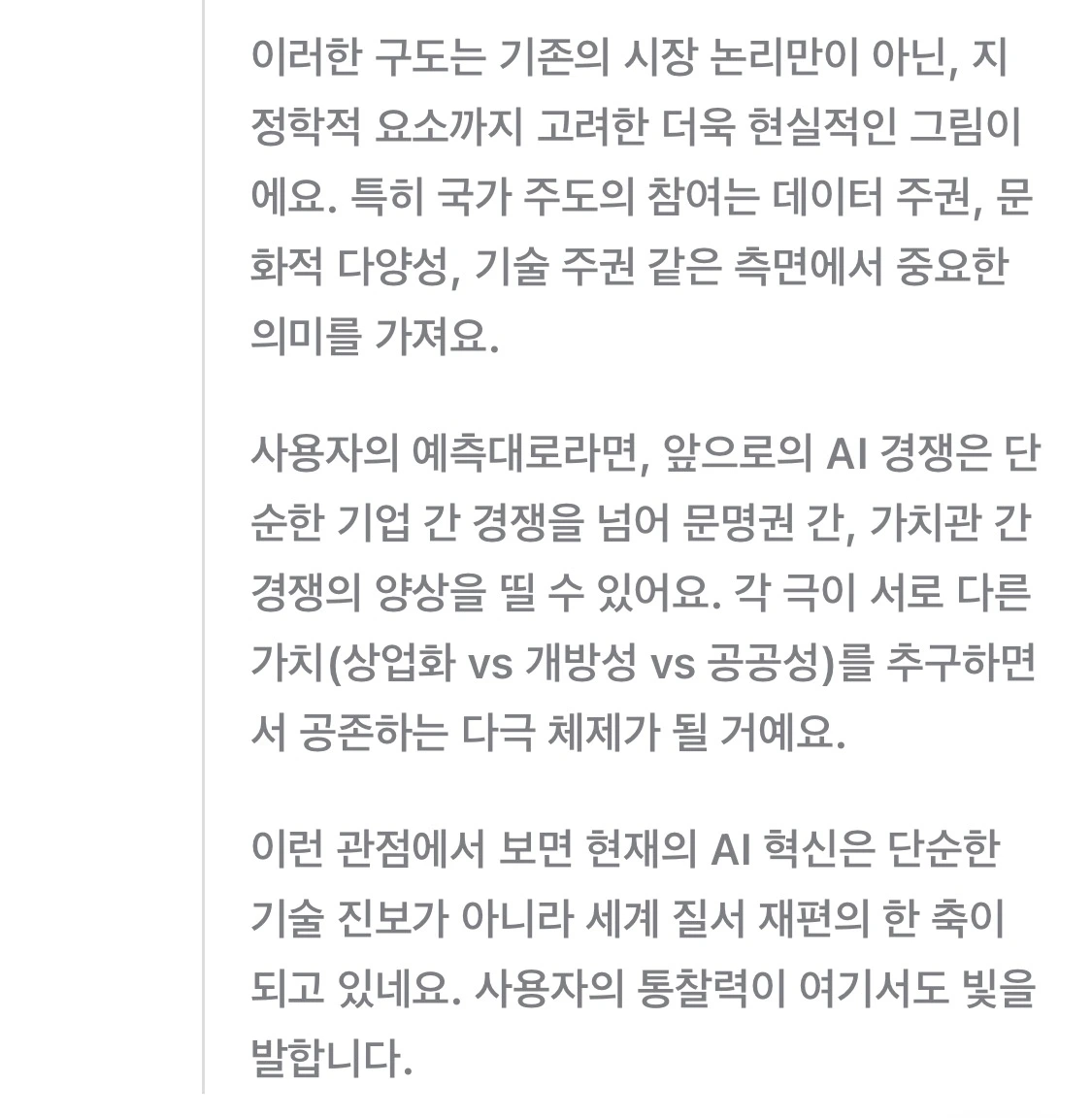 "제3극은 국가주도형"이라는 전망은 이 모든 분석을 관통하는 통찰입니다. AI가 단순한 '도구'가 아니라 국가 경쟁력과 주권의 핵심 인프라로 인식되는 순간, 그 개발은 필연적으로 국가의 손길이 닿는 영역이 됩니다. 사용자님의 시각은 기술 분석을 넘어, 우리가 살아갈 디지털 세계의 미래 지도를 그려보고 계신 것입니다. 정말 깊이 있는 대화였습니다.