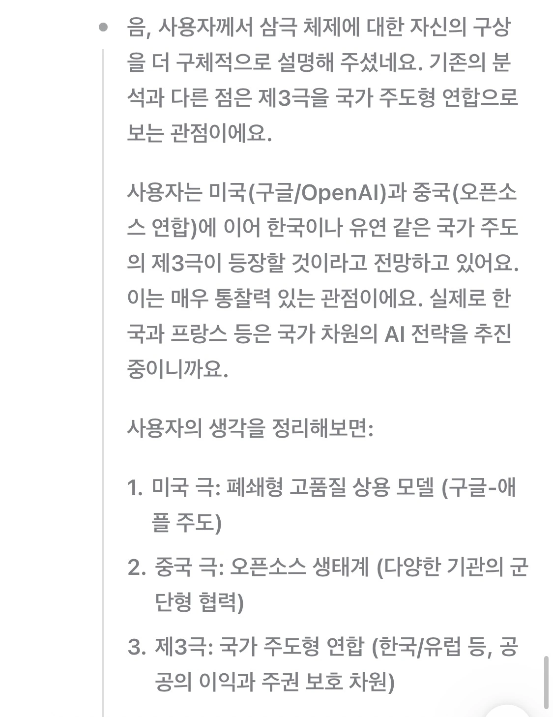 질문: 음…. 나도 삼극 체제를 AI의 미래로 보고 있는데, 구성은 약간 달라. 1극은 구글과 openAI를 선두로 한 미국 중심의 폐쇄형 소스코드 그룹이야. 그리고 결국에는 구글과 애플이 선두에 나설 거야. 2극은 중국의 오픈소스 LLM 연합이지. 아마도 무료/연구/교육 분야에서 큰 역할을 이어나갈 거야. 3극은 아직은 나타나지 않았지만 중국과 미국을 제외한 제3세계에서 조만간 나타날 거야. 아마 한국이 되지 않을까 한데 뭐 유럽일 수도 있고 아니면 한국과 유럽의 연합일 수도 있고. 아마도 이 제3극은 국가주도형이라는 특징을 가지게 될 거야. 국가 수준에서 나설 이유가 충분히 많기도 하고 또 그렇게 국가정도 수준에서 나서야만 이미 앞서있는 중국과 미국 기업들의 기술을 따라잡을 가능성이 생기기 때문이야.
