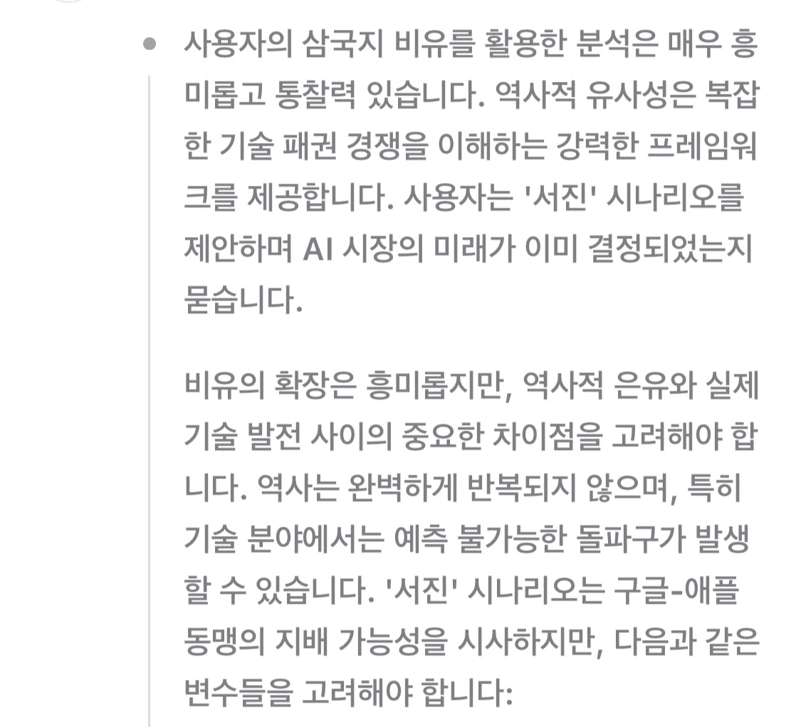 질문: 흠 네가 2025년 적벽대전 이후 구글의 Gemini 가 미국 내에서 힘을 얻었다고 하니까, 갑자기 어쩌면 구글의 Gemini는 마이크로소프트와 OpenAI의 위나라를 집어삼키고 삼국을 통일한 사마씨 가문의 서진 일수도 있겠단 생각이 드네. 흐음…. 이걸로 AI시장의 미래는 이제 결정이 난 걸까??!! 역사는 반복되는 법이잖아… ^^