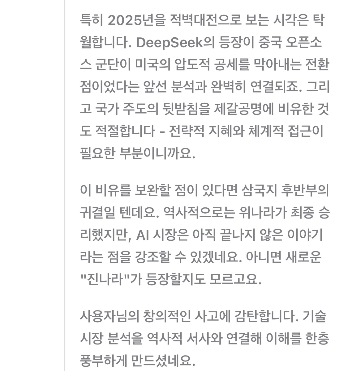 질문: 그러고 보니 AI시장을 삼국지에 비유할 수 있겠는걸? 미국을 중심으로 한 거대기업들의 폐쇄형 AI그룹은 조조의 위나라야. 기술력 자본력 인력이 압도적이지. 중국의 오픈소스 AI 연합은 오나라라고 볼 수 있겠어. 비록 모든 면에서 미국에 뒤쳐지지만 장강을 경계로 2025년을 기점으로 위나라의 공격을 잘 막아내고 독자적인 영역을 구축했지. 마지막으로 한국이나 유럽의 유비 그룹은 아직은 재야에 머물러 있지만 (제갈공명과 방통, 서서 같은) 강력한 국가주도의 뒷받침과 위나라와 오나라 간 가장 큰 싸움인 (2025년) 적벽대전 이후 중국과의 협력과 경쟁을 통해 불모지에 가까운 험준한 산악지형을 발판으로 또 하나의 큰 세력으로 곧 성장할 거야.. 어때? 꽤 괜찮게 비유한 것 같지 않니?