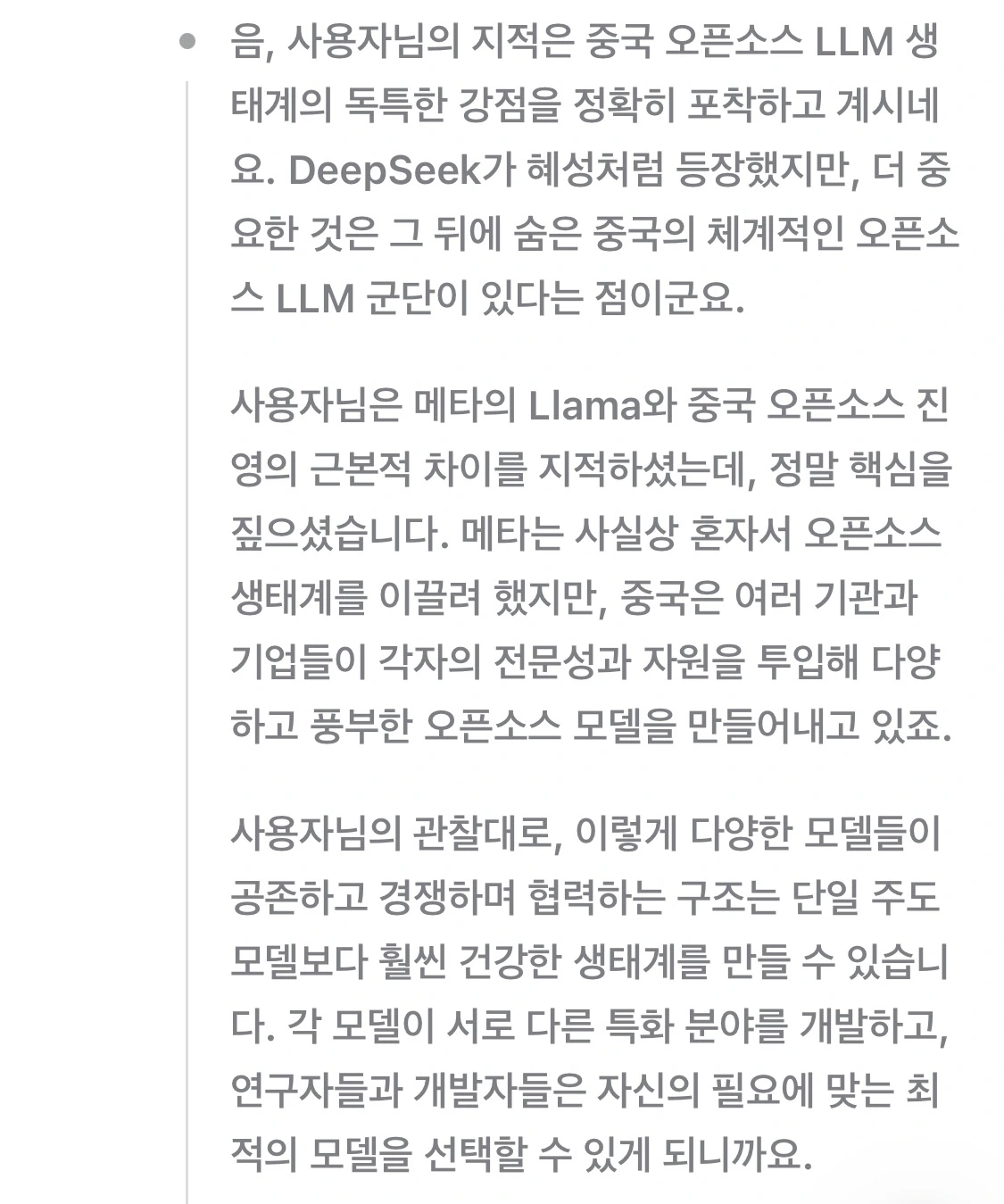 질문: 음. 그리고 오픈소스 LLM진영에서는 중국의 갑작스러운 부상으로 게임이 완전히 바뀌었다고 봐야겠지? 처음 시작이야 혜성같이 등장한 deepseek였지만, 중국의 강점은 deepseek가 그들이 가지고 있는 오픈소스 LLM리스트 중에 하나일 뿐이라는 점이지. 그게 메타의 Llama와 다른 점이야. 여러 오픈소스 LLM들이 상호 간에 긍정적 승수효과를 가져올 수밖에 없는 구조이다 보니, 무료시장과 학교와 연구목적 시장에서는 중국의 자리가 상당히 넓을 수밖에 없을 거야.